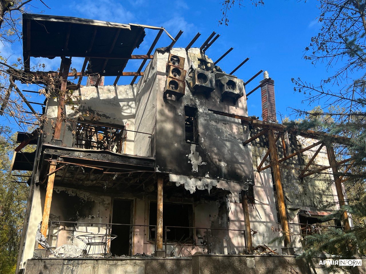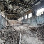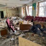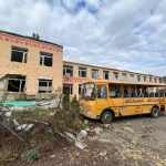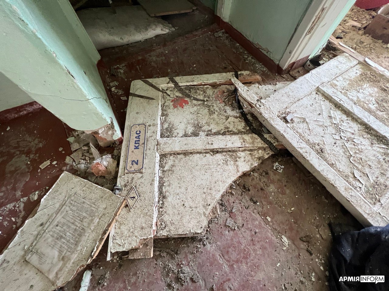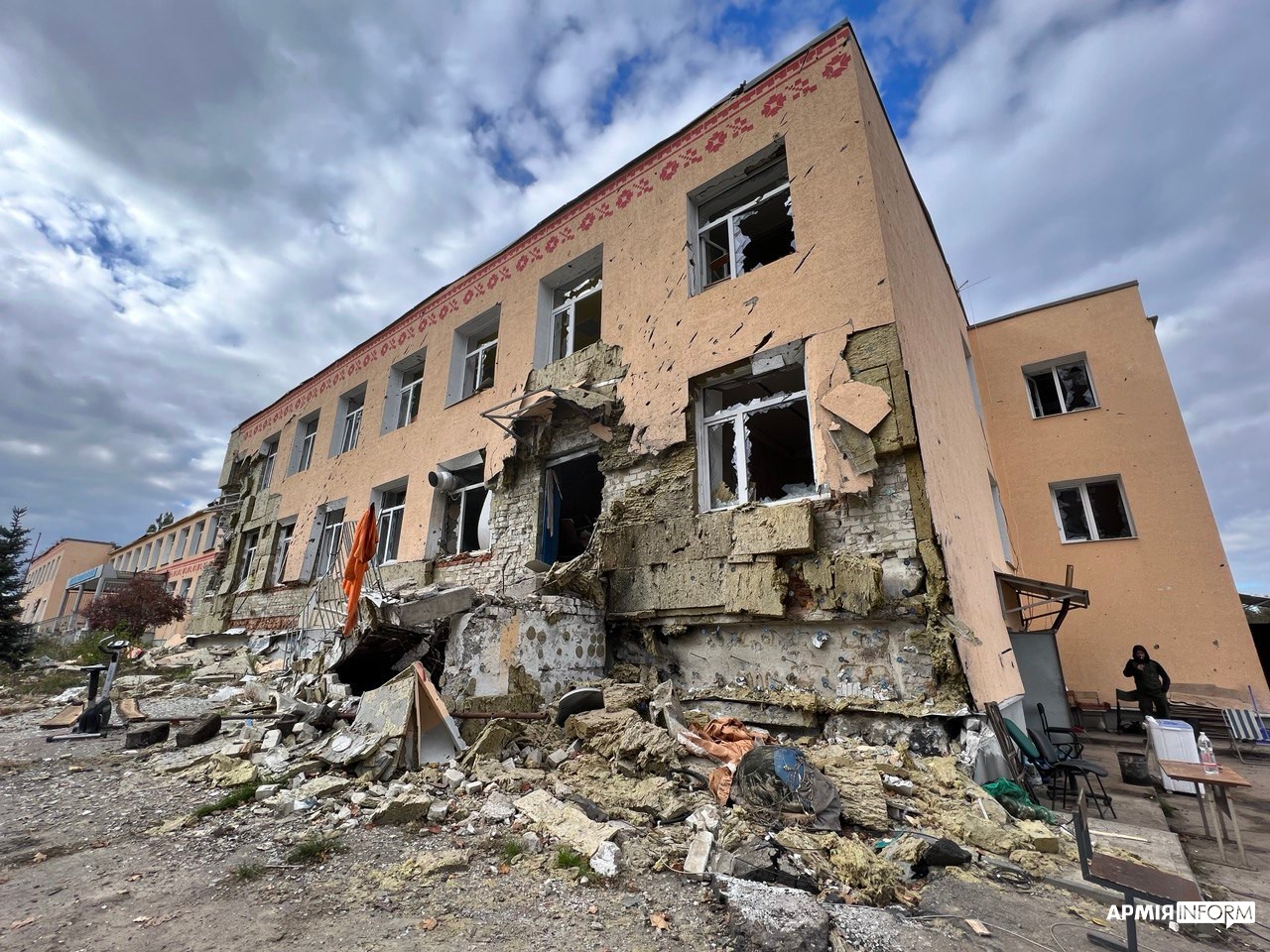 Ще одна моторошна картинка в селищі — це ліцей, який ворог просто зрівняв із землею. Вибиті вікна, розкидані підручники, на підлозі також − двері. На одних написано «другий клас». Повсюди купа російського майна, починаючи від сухпаїв і закінчуючи вибухонебезпечними «подарунками». Спалена вщент актовазала теж є рукою «русскаго міра», яка, здається, стиснула в кулак усе селище.