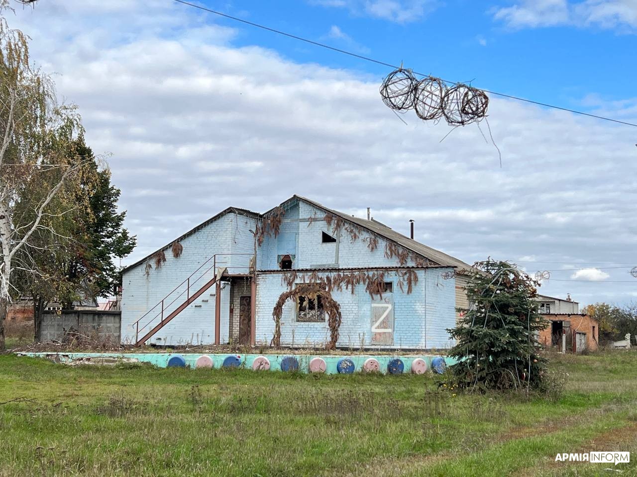 У центрі селища біля закинутої сільської будівлі, звісно ж, з величезним рашистським «Z» на всі двері, росте ялинка, прикрашена новорічними іграшками та гірляндою…
