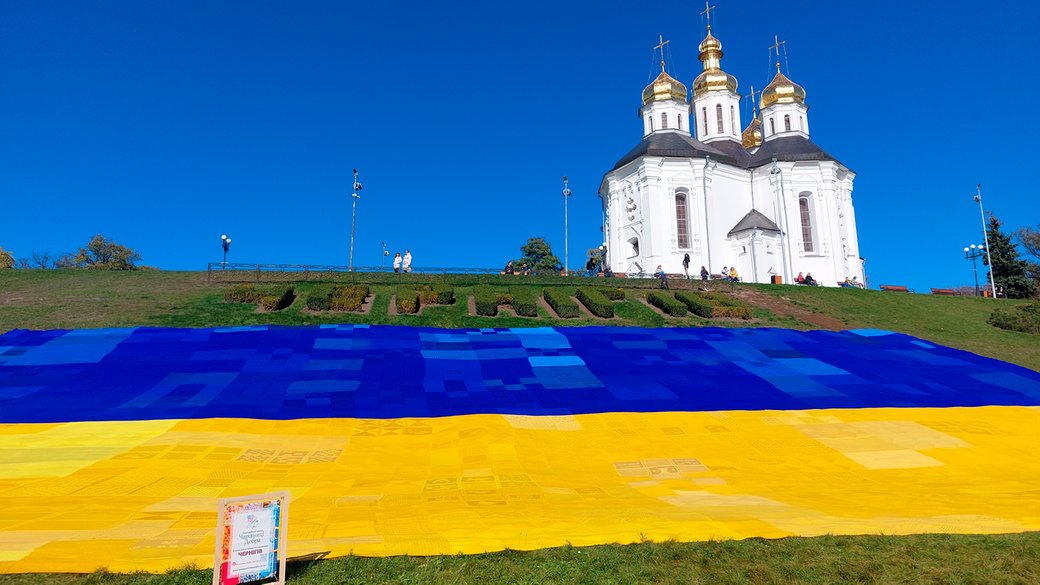 Сьогодні, 14 жовтня, біля Катерининської церкви у Чернігові встановили новий рекорд України з найбільшого по розміру в’язаного прапора.