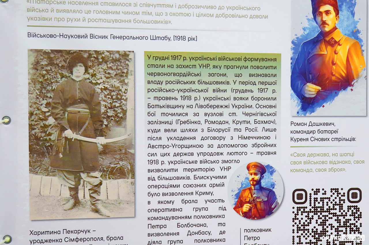 На стендах показана історія героїчної боротьби українців за встановлення української державності. Світлини та військовий одяг минулої епохи, що реконструювали науковці, створювали атмосферу часів визвольної боротьби армії Української Народної Республіки (197–1921 років), Української повстанської армії 40-х років ХХ століття, Збройних Сил України після 2014 року.