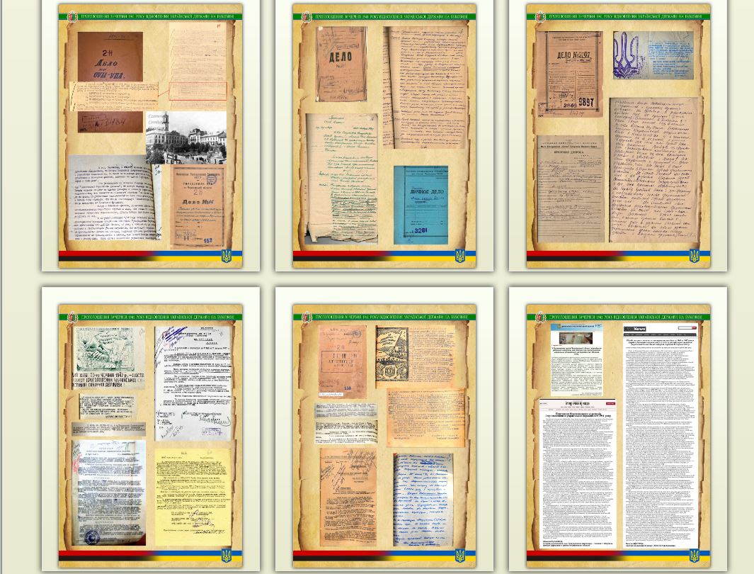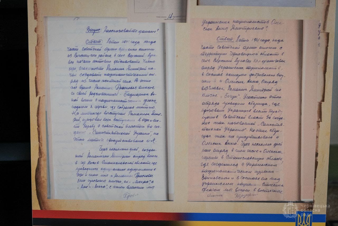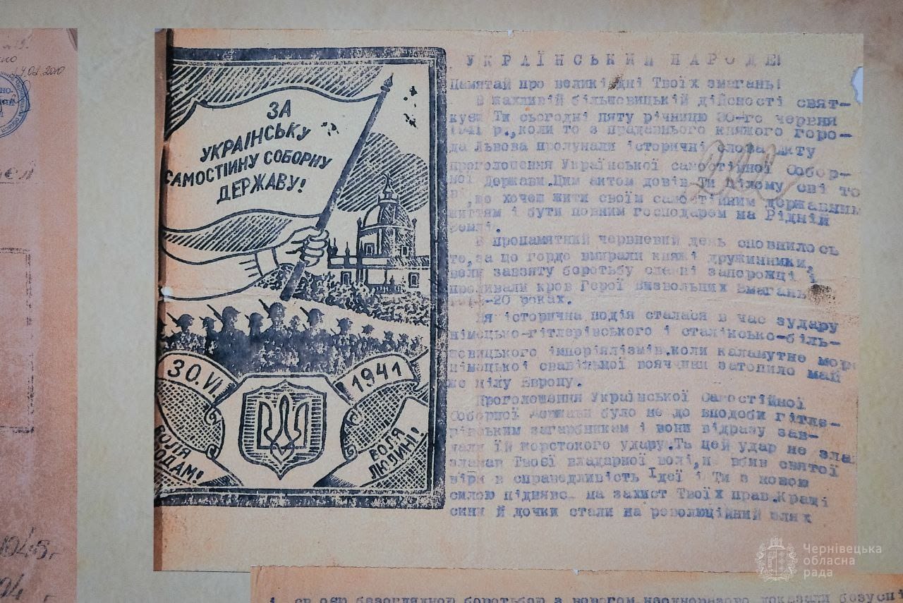 Серед документів виставки — Наказ № 1 від 21 січня 1943 року Південно-Західного Командування Крайового Проводу Організації Українських Націоналістів Самостійників Державників Південно-Західних Українських земель щодо порядку вступу до Української Армії. Тут є й інформаційне донесення жандармського посту в комуні Іспас Сторожинецького повіту про діяльність українських націоналістів у долині р. Черемош. Цікавими є й витяги зі слідчих справ на буковинців, звинувачених в антирадянській діяльності в ОУН-УПА, копія довідки начальника слідчого відділу УМДБ Чернівецької області про антирадянську діяльність куреня УПА «Луговий» на території області, рішення XVI сесії XXII скликання Чернівецької обласної Ради від 30 січня 1998 року «Про статус ветеранів ОУН-УПА, гарантії їх соціального захисту» та інші документи.