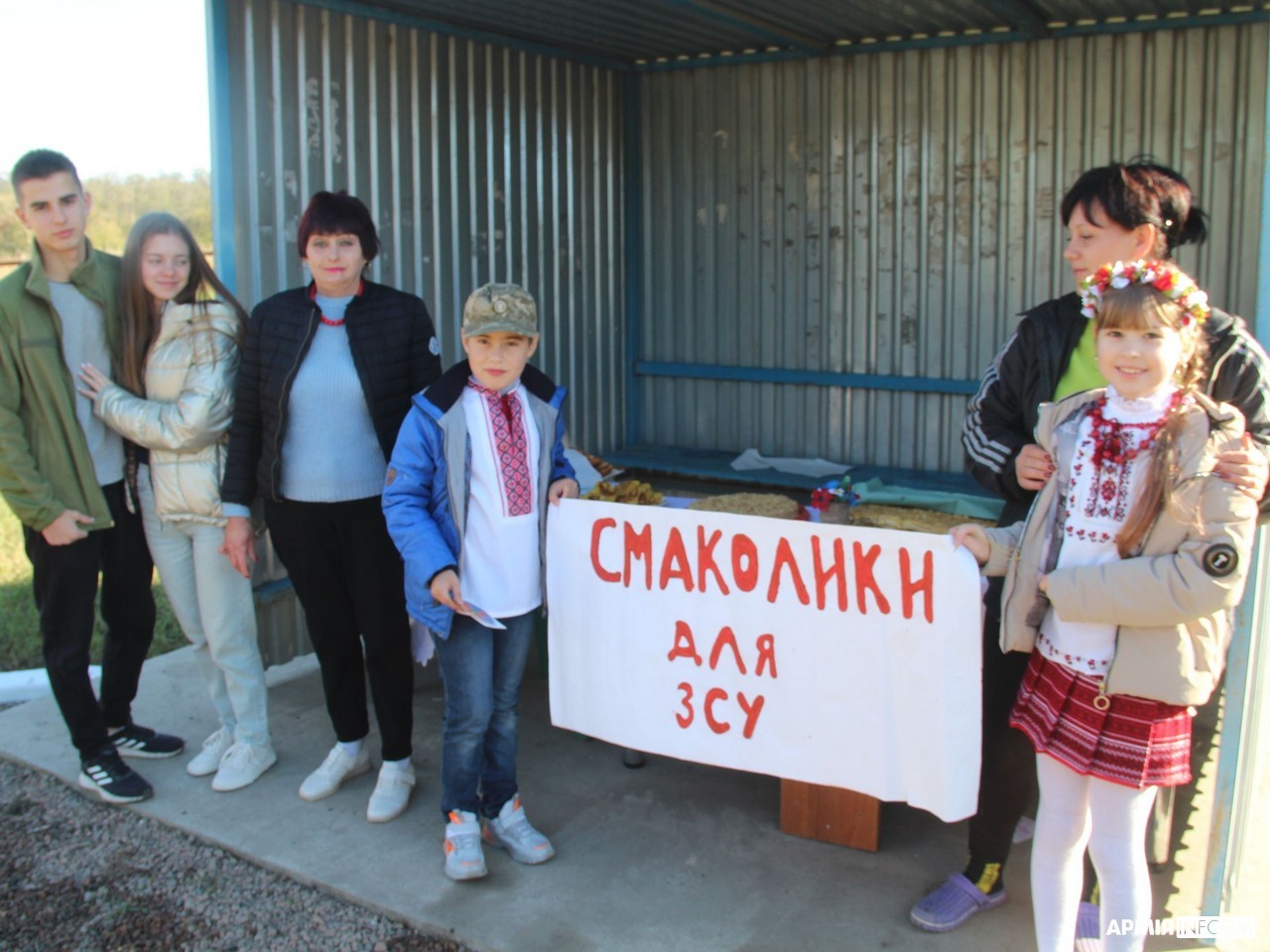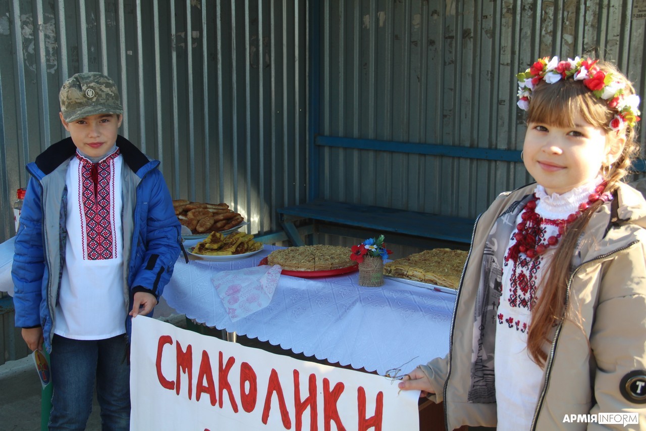 — Ми дуже чекали на нашу армію, наших визволителів, і діти захотіли їм зробити щось приємне, — розповіла одна з жінок, яка стояла разом із дітьми на зупинці біля столика з пиріжками й тістечками. Вона назвалась пані Оленою. — Ось вони — малі «організатори» — Максимко й Іринка, а разом з ними Христинка і Вадим. Ми лише їм допомогли.