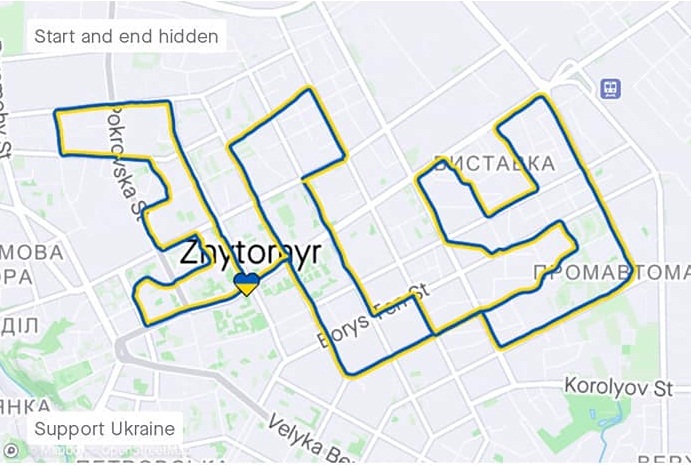 Житомирські спортивні активісти передають привіт Збройним Силам України — своїм забігом вулицями обласного центру вони намалювали GPS-треком напис «ЗСУ».