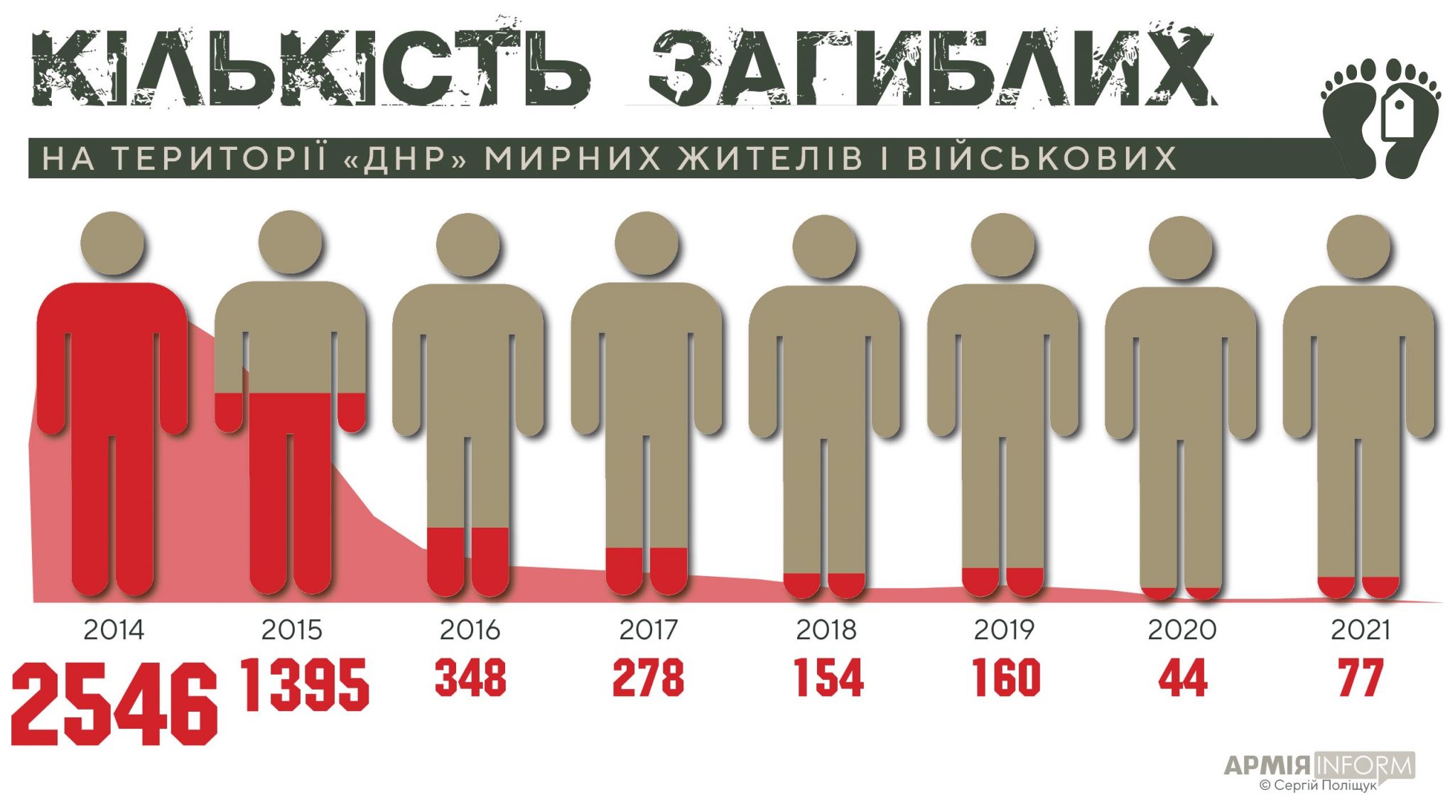 Тож, за даними «днр», більша частина жертв припала на перші два роки конфлікту — 2014-й (тоді загинуло 2546 осіб) та 2015-й (загинули 1395 осіб). Після цього інтенсивність конфлікту знизилася й жертв поменшало. У 2016-му загинули 348 осіб, у 2017-му — 278 (з них 32 цивільних, решта — військові «днр»), у 2018-му — 154 (19 цивільних), у 2019-му — 160 (9 цивільних).