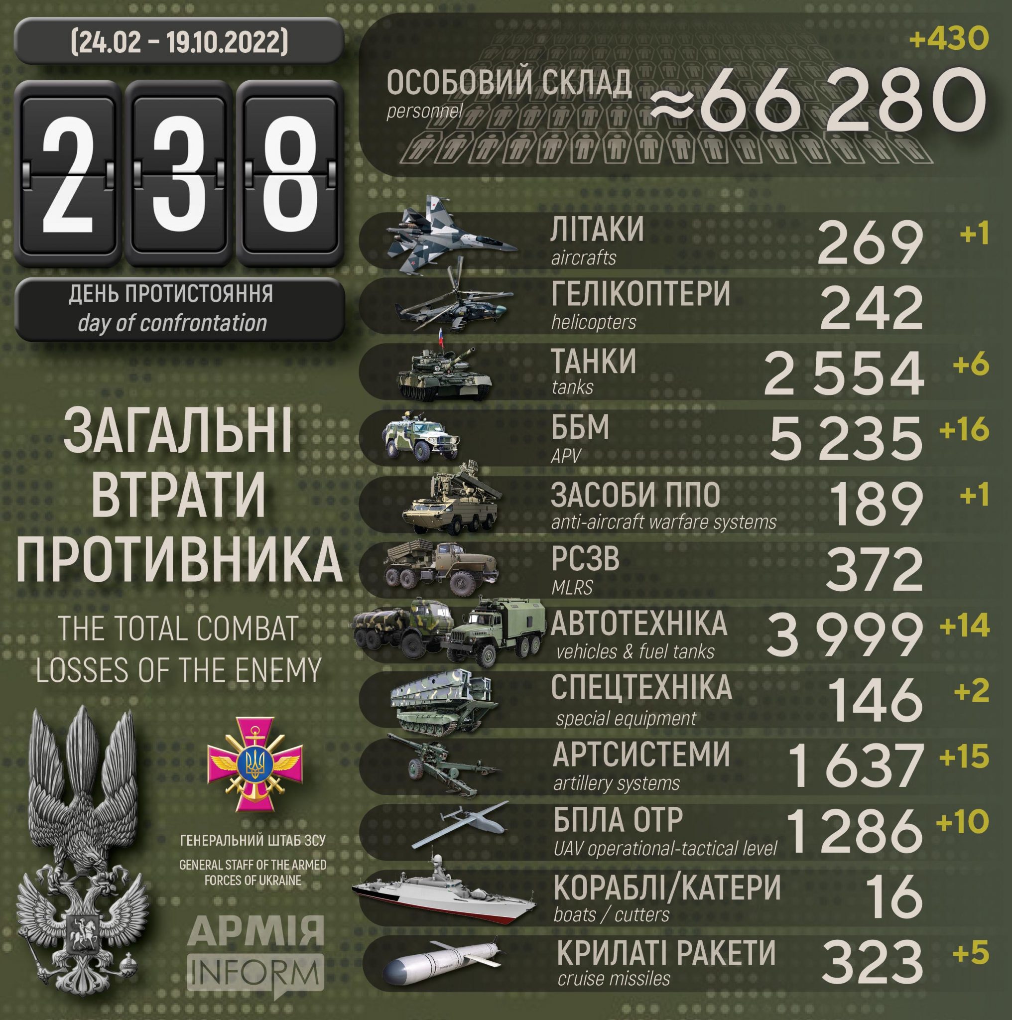 Загальні бойові втрати противника з 24.02 по 19.10 орієнтовно становлять: