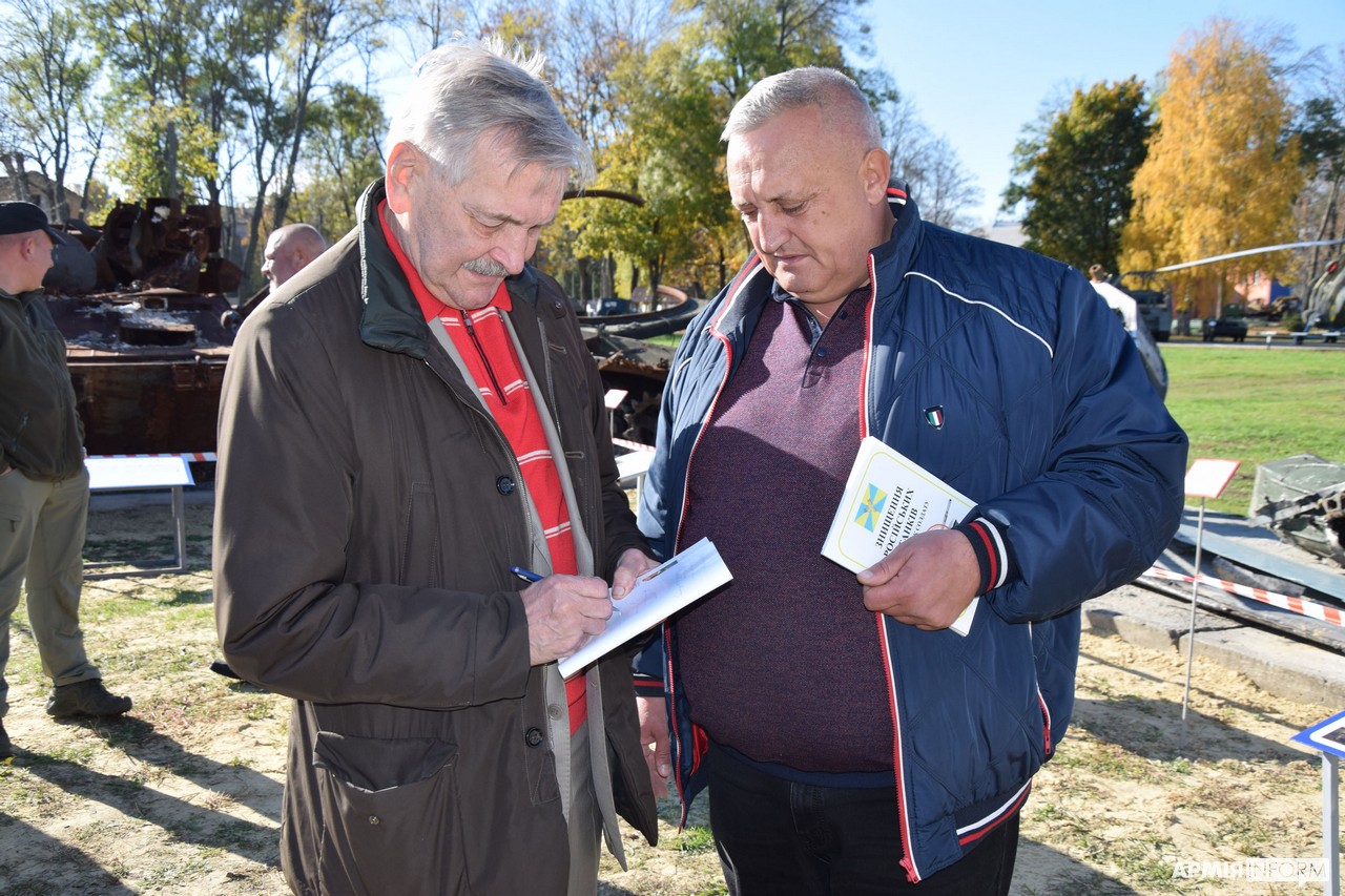 Так, на відкритому майданчику відвідувачам представили рашистську військову техніку, яку знищили та захопили воїни ЗСУ, — загалом 10 експонатів привезли з Тростянця, Охтирки, Гадяча та Київщини. Серед них — танк, гаубиця, бойова машина піхоти, бронетранспортер, рештки гелікоптера та хвостова частина літака СУ-25 СМ.