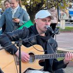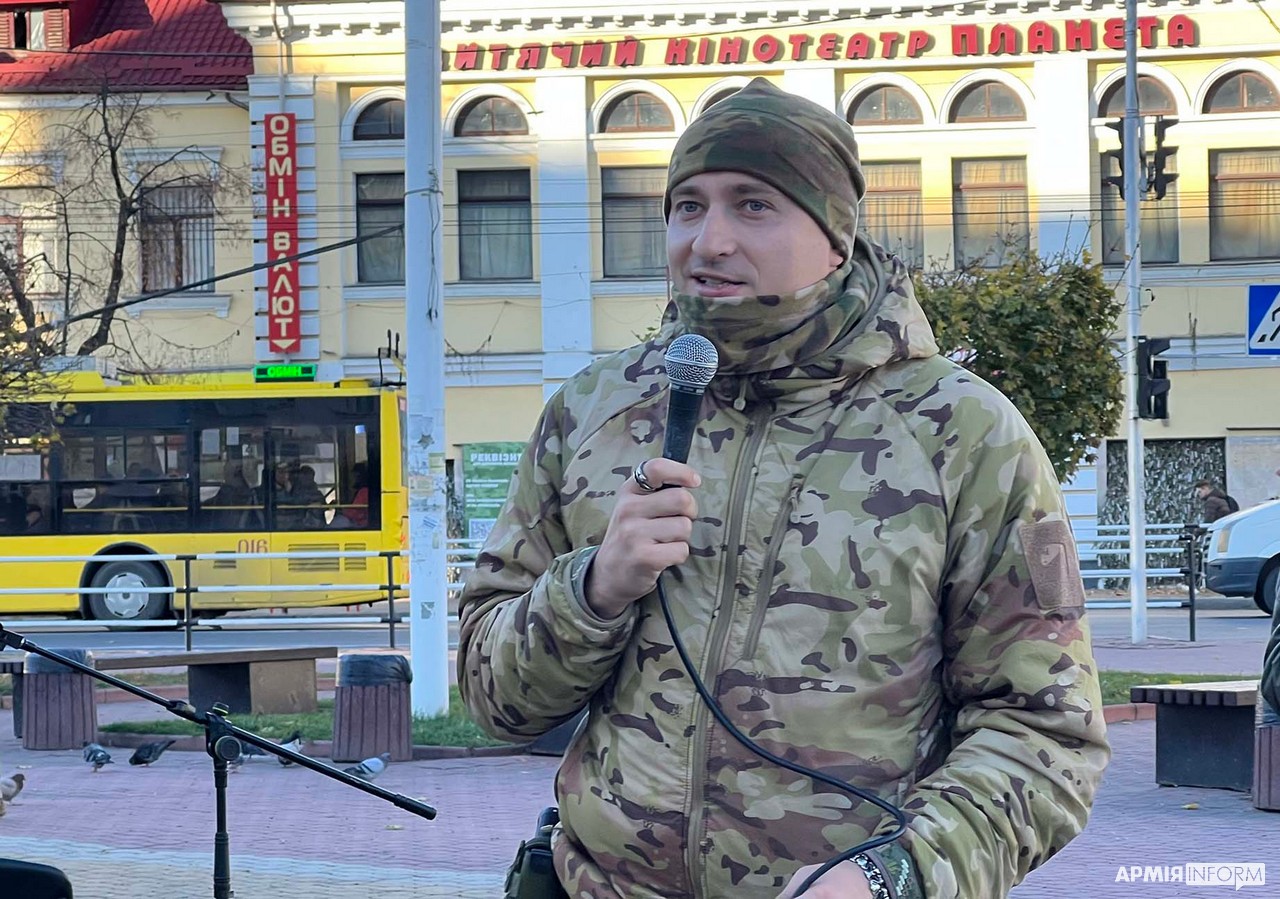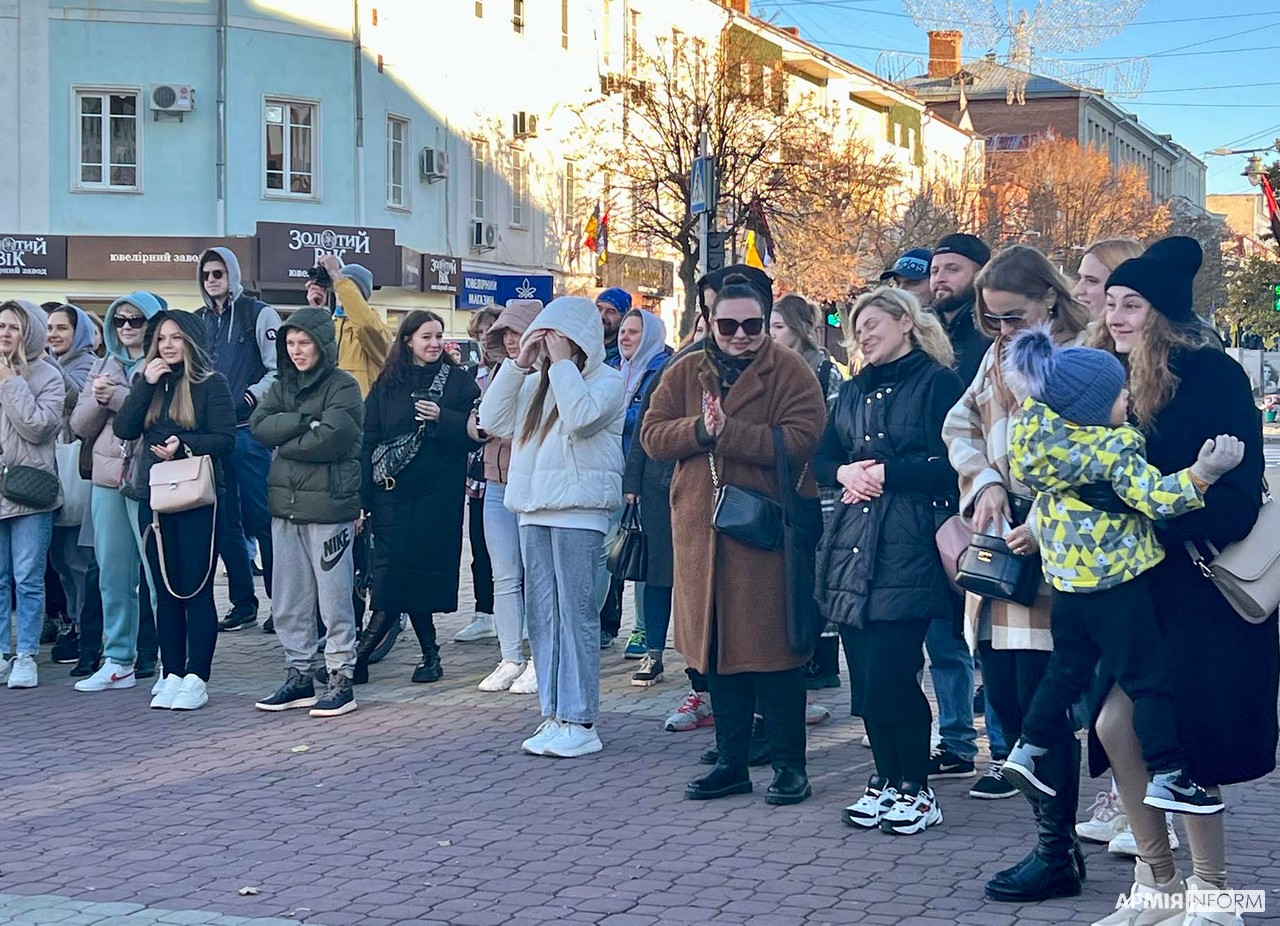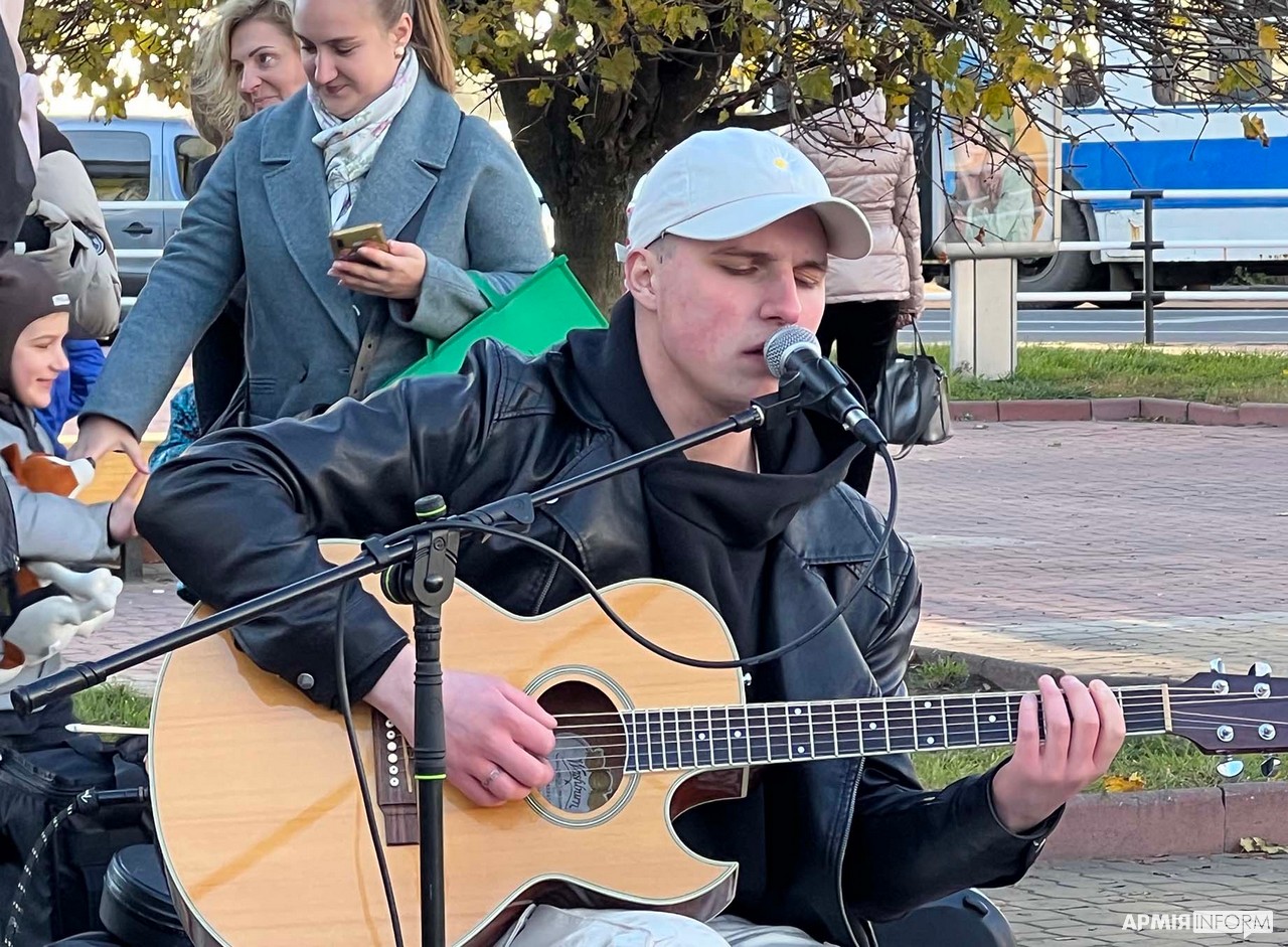 Послухати як чуттєві, так і запальні пісні у центрі Хмельницького зібралося чимало люду. Олена — одна із них. Дівчина говорить, що вже завтра віднесе теплу ковдру, кілька светрів та з десяток своїх книг до пункту збору речей для мешканців Ізюма.