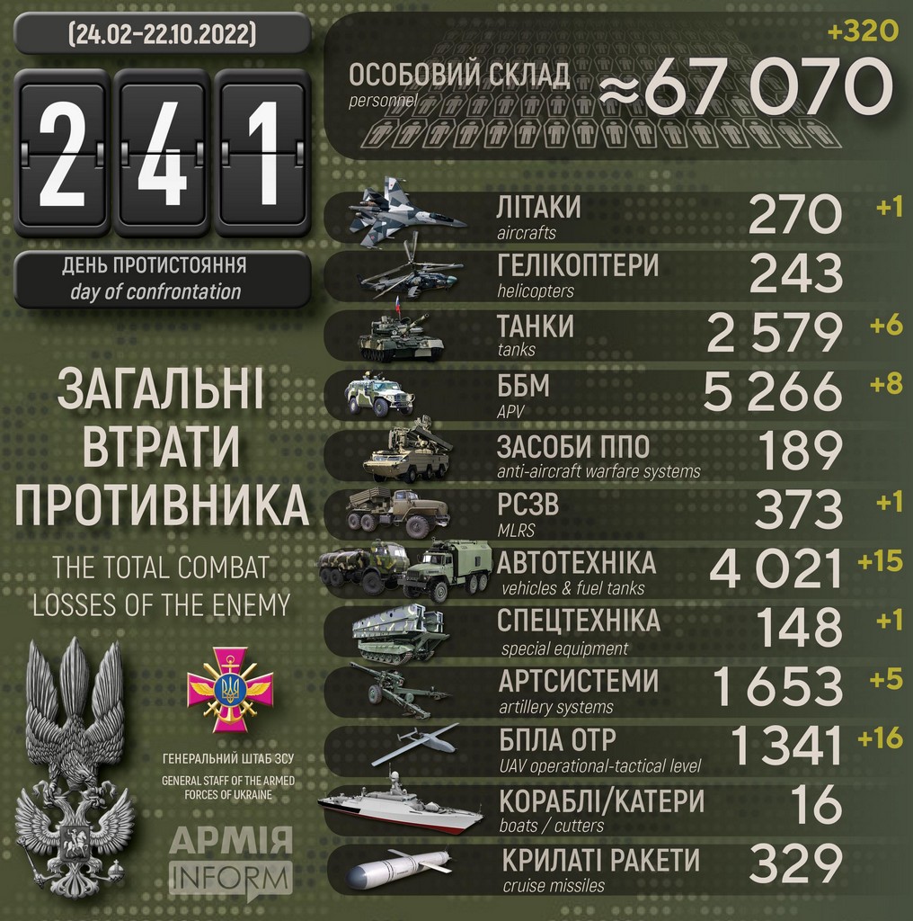 Загальні бойові втрати противника з 24.02 по 21.10 орієнтовно становлять: