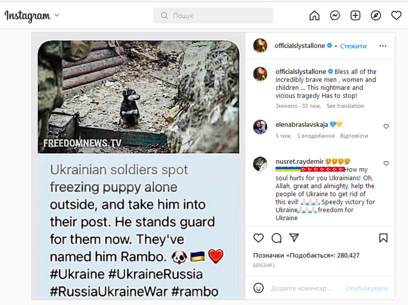 1 березня 2022 року Сильвестр Сталлоне розмістив у соціальній мережі Instagram фото цуценяти, якого врятували українські військові, взявши його на свої позиції. Світлину супроводжував лаконічний підпис: «Українські військові помітили замерзаючого цуцика на вулиці та забрали його на свій пост. Зараз він стоїть на варті. Вони назвали його Рембо». Додаючи власний коментар до фотографії, Сталлоне написав: «Благослови (Господь. — Авт.) усіх неймовірно сміливих чоловіків, жінок і дітей… Цей кошмар і жахлива трагедія мають припинитися!».