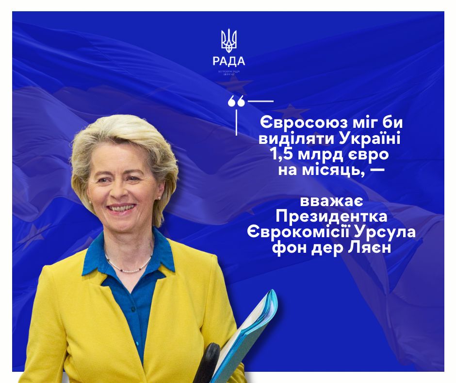 Європейський Союз розглядає можливість виділяти Україні по €1,5 млрд щомісяця, повідомила глава European Commission Урсула фон дер Ляєн на пресконференції у Брюсселі.
