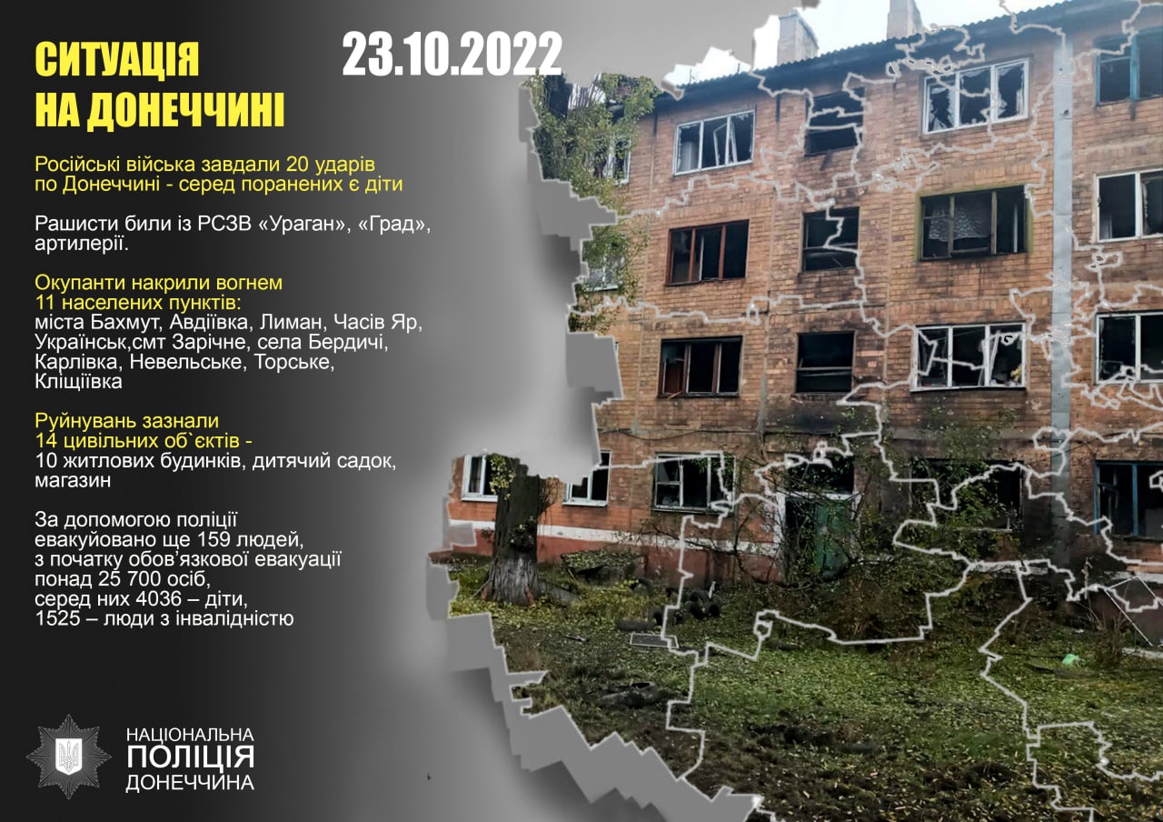 «Поліція зареєструвала порушення законів та звичаїв війни з боку окупаційних військ. Внаслідок воєнних злочинів рф загинули цивільні мешканці, є травмовані. Ворог обстріляв міста Бахмут, Авдіївка, Лиман, Часів Яр, Українськ,смт Зарічне, села Бердичі, Карлівка, Невельське, Торське, Кліщіївка. Рашисти били із РСЗВ «Ураган», «Град», артилерії. Зруйновано та пошкоджено 14 цивільних об‘єктів – 10 житлових будинків, дитячий садок, магазин», – йдеться у повідомленні.