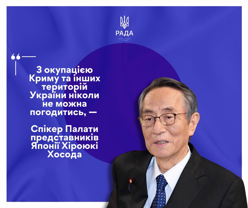 російська окупація Криму, Донецької, Луганської, Запорізької та Херсонської областей порушують суверенітет і територіальну цілісність України, — заявив Спікер Палати представників Національного Парламенту Японії Хіроюкі Хосода під час Першого Парламентського саміту Міжнародної Кримська платформа.
