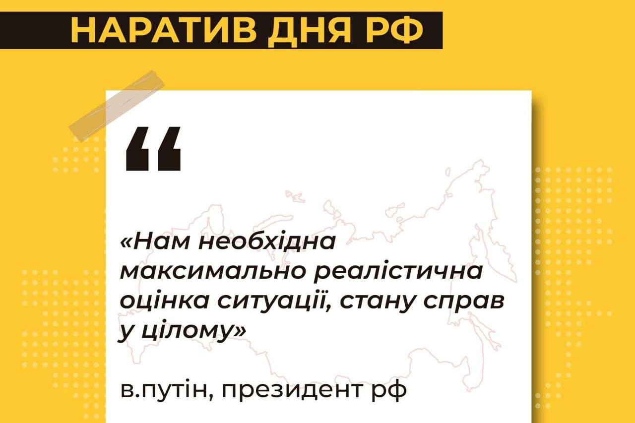 Основний наратив, що сьогодні просувають російські ЗМІ, — це слова президента росії путіна про необхідність максимально реалістичної оцінки ситуації.