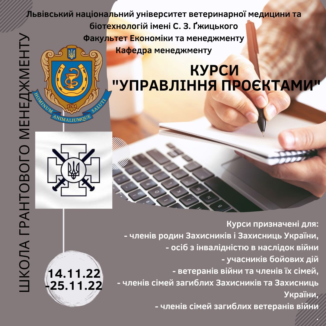 На базі Львівського національного університету ветеринарної медицини та біотехнологій з 14 листопада розпочнуться курси «Управління проєктами» в рамках вже наявного проєкту «Школа грантового менеджменту» для ветеранів російсько-української війни. Ініціатором цього навчання виступив територіальний відділ Міністерства у справах ветеранів України, а організаторами – львівські викладачі основ менеджменту та провідні спеціалісти.