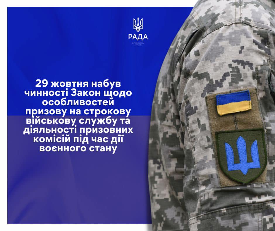 29 жовтня набув чинності Закон «Про внесення зміни до Закону України «Про військовий обов’язок і військову службу» щодо особливостей призову на строкову військову службу та діяльності призовних комісій під час дії воєнного стану.