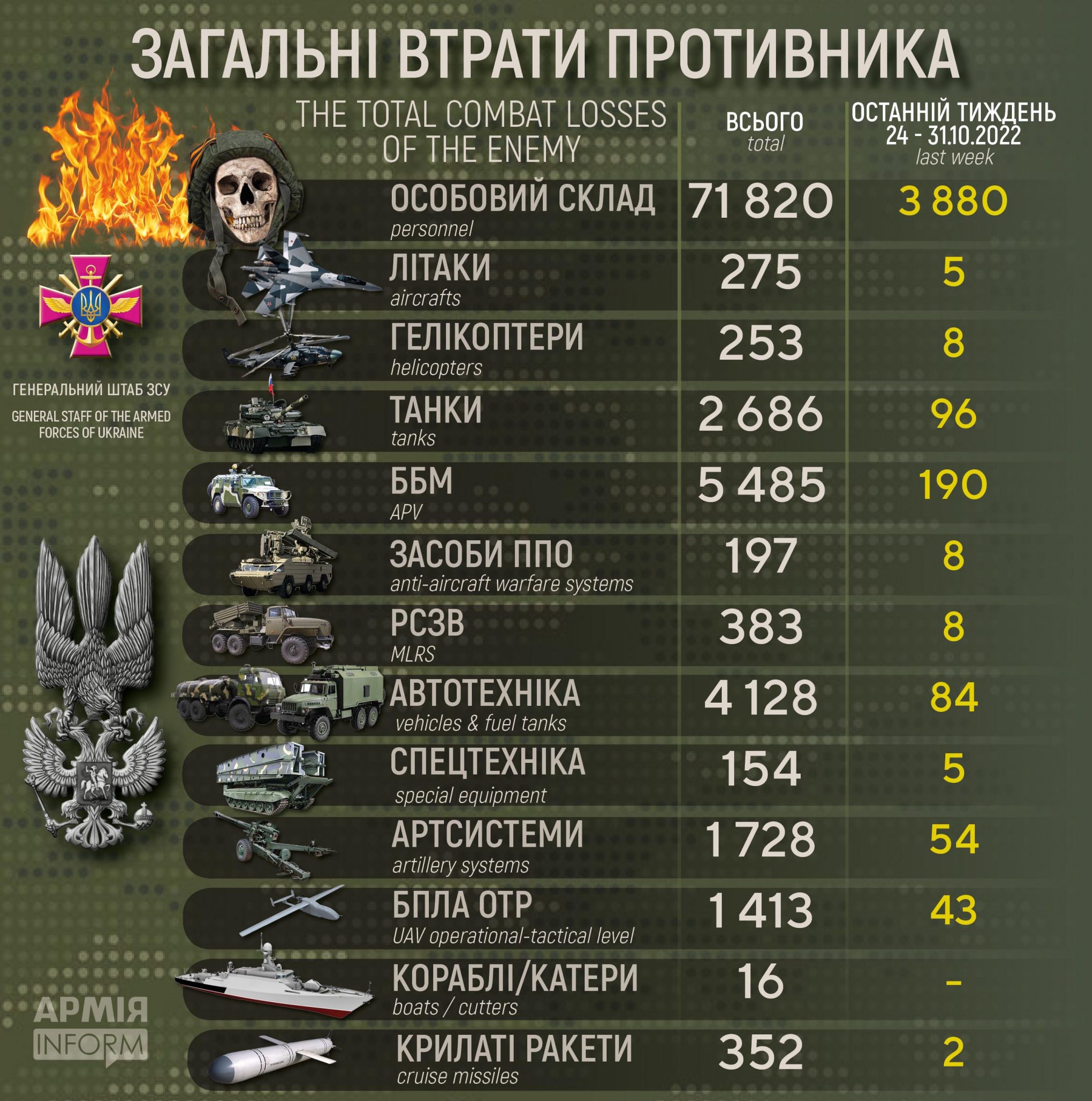 Загалом з початку широкомасштабного вторгнення за період з 24 по 31 жовтня російська окупаційна армія втратила: