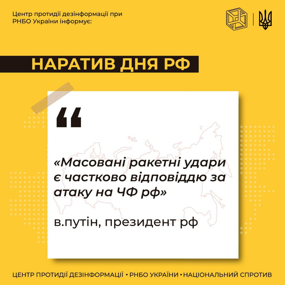 Центр протидії дезінформації при РНБО України інформує про основний наратив, що наразі просувають російські ЗМІ. А саме, намагаються виправдати масовані ракетні удари по мирних населених пунктах України, начебто «частковою відповіддю за атаки на чорноморський флот рф». Таку заяву, зокрема, зробив і кремлівський очільник путін.