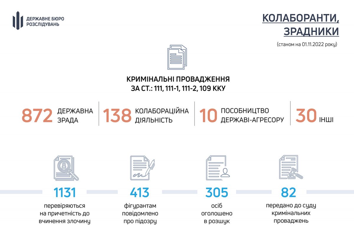 413 фігурантам уже повідомлено про підозру, 305 осіб оголошено у розшук, 1131 особа перевіряється на причетність до державної зради та колабораційної діяльності. До суду за цими статтями вже направлено 82 провадження.