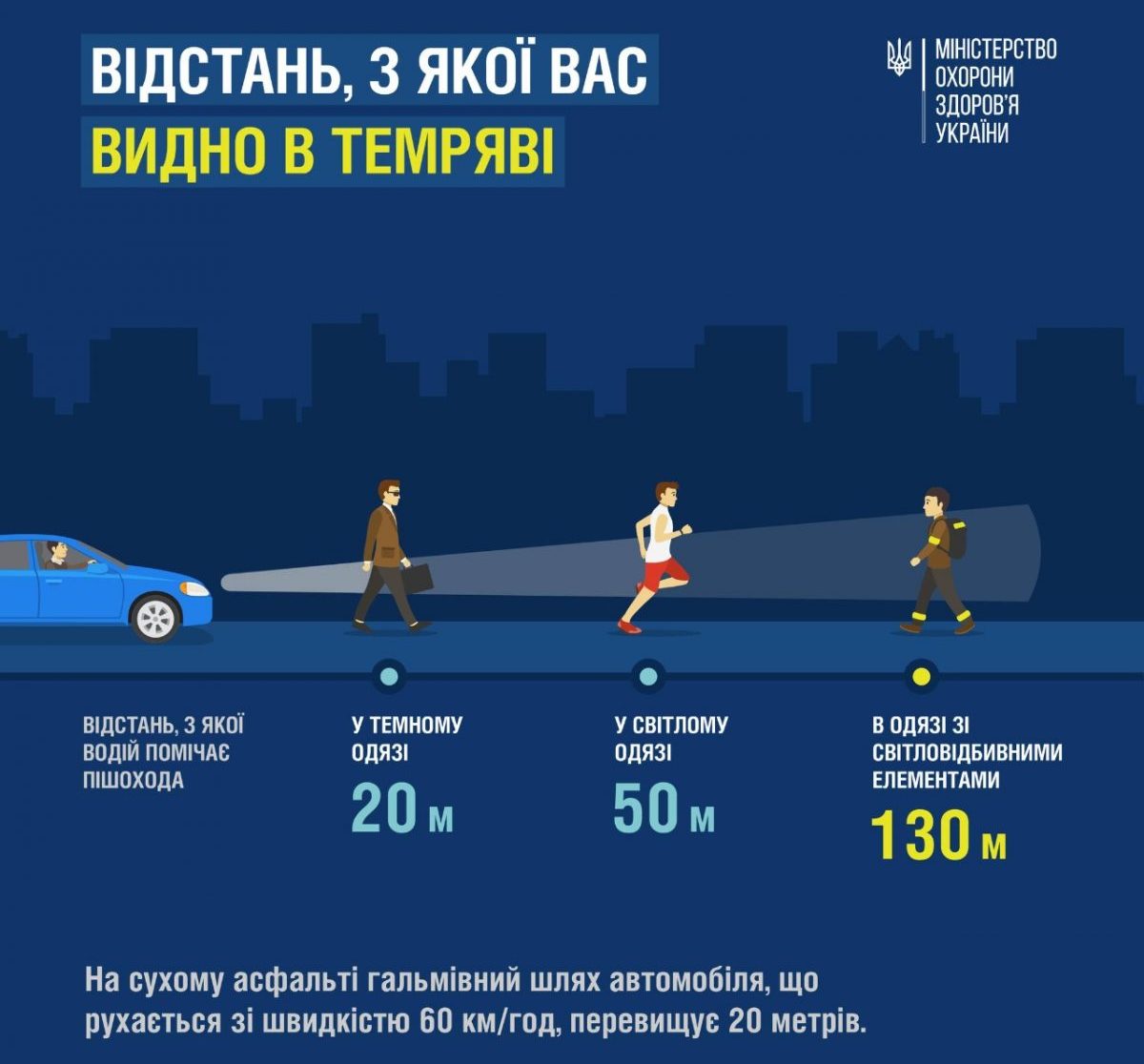 Тому Міністерство охорони здоров’я України закликає пішоходів вжити заходів, аби бути більш помітним у темряві, а отже, зберегти здоров’я та життя. На своїй сторінці у Facebook МОЗ повідомило, як убезпечити себе на вулиці в темний період доби: