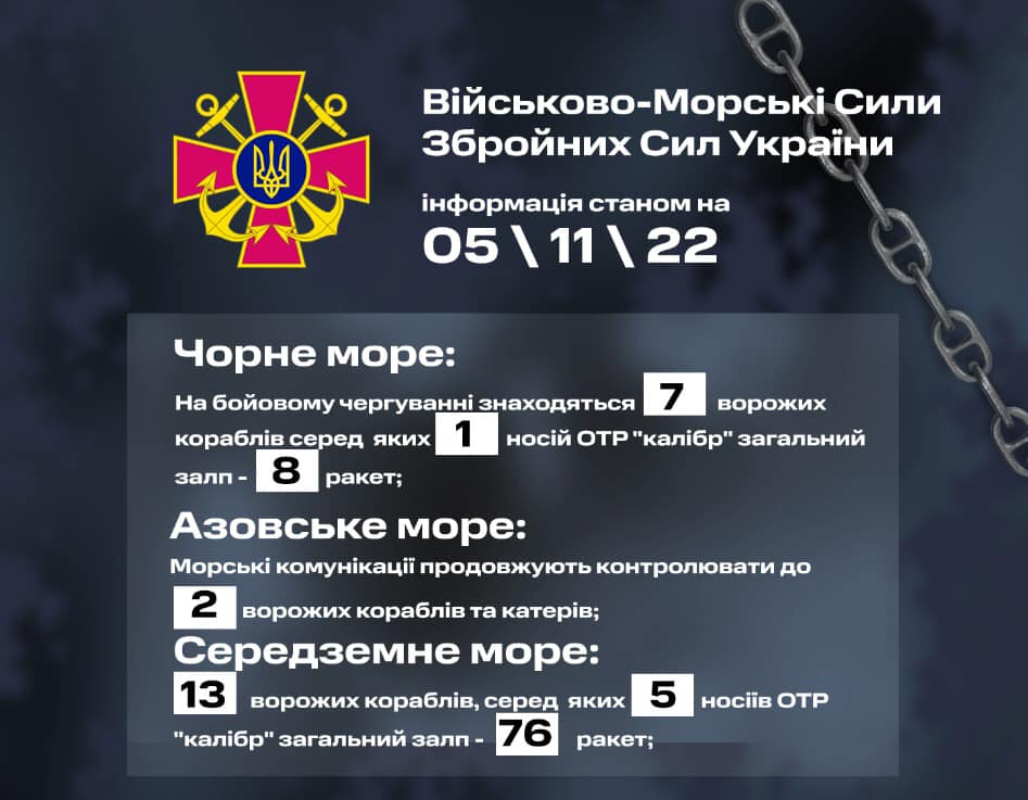 Крім того, за даними командування Військово-Морських Сил ЗСУ, станом на 5 листопада 2022 року, в Азовському морі ворог продовжує контролювати морські комунікації, утримуючи на бойовому чергуванні до двох кораблів та катерів, а в Середземному морі — 13 ворожих кораблів, із них п’ять носіїв крилатих ракет «Калібр» загальним залпом 76 ракет.