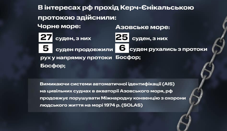 Також, за інформацією ВМС ЗСУ, за добу в інтересах рф прохід Керч-Єнікальською протокою здійснили 25 та 27 суден — до Азовського та Чорного морей, відповідно.