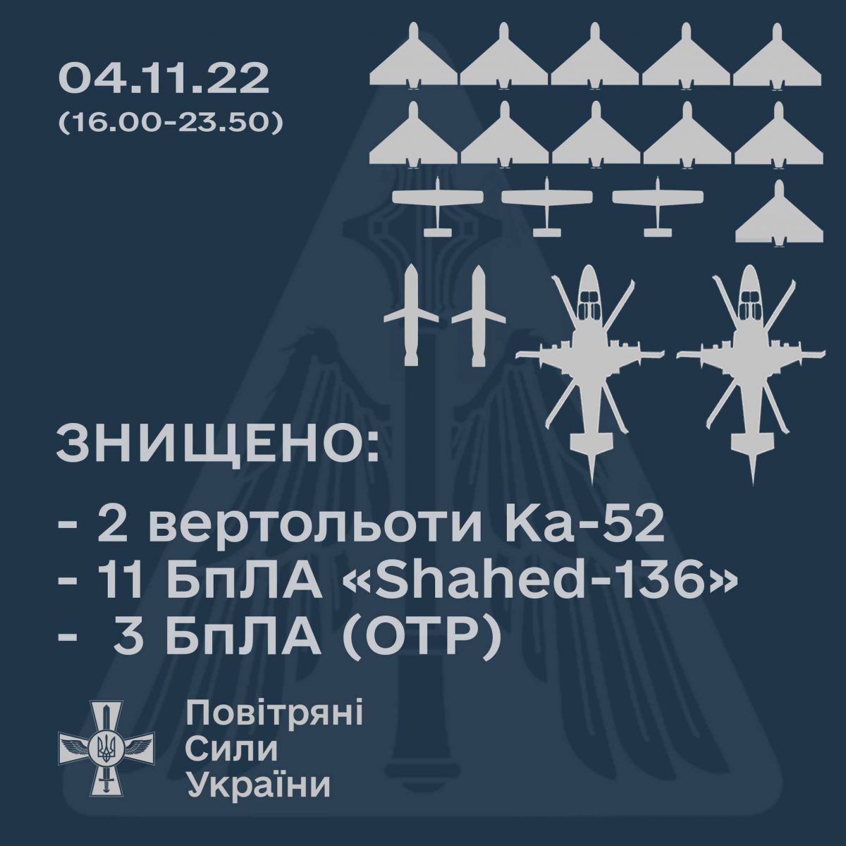 4 листопада, близько 16-ї години, на південному напрямку протиповітряною обороною Повітряних Сил збито дві крилаті ракети «Калібр».