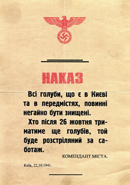 Уже 21 вересня по місту були розвішані накази за підписом коменданта міста генерала Ебергардта. Згідно з ними, жителі повинні були негайно здати зброю, радіоприймачі, протигази, військову амуніцію і…голубів! Справа в тому, що нацисти боялися використання цих птахів як нелегального засобу зв’язку. А 29 вересня у Бабиному Яру фашисти розстріляли понад 33 тисячі євреїв. За 2 дні. Після цього життя пересічних киян перетворилося на суцільне жахіття.