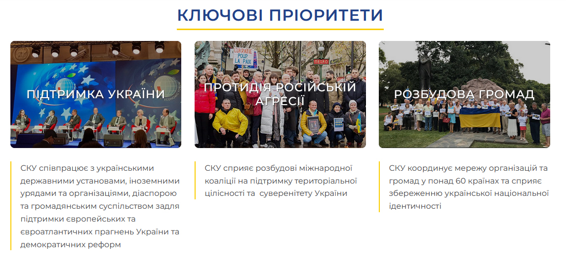 Головними інструментами СКУ в цьому плані є звернення до урядів країн перебування української діаспори та міжнародних, праця з громадською думкою через ЗМІ та різноманітні заходи на підтримку України. У демократичних країнах, де дослухаються до думки й голосу суспільства, ці заходи є дієвими і вагомими. Саме вони є запорукою тієї масштабної підтримки, яку отримує Україна у протистоянні агресії російської федерації.