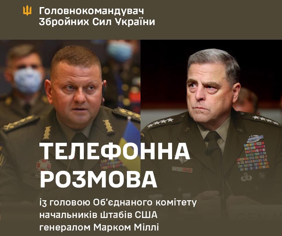 Головнокомандувач Збройних Сил України генерал Валерій Залужний поспілкувався телефоном з Головою об’єднаного комітету начальників штабів США генералом Марком Міллі.