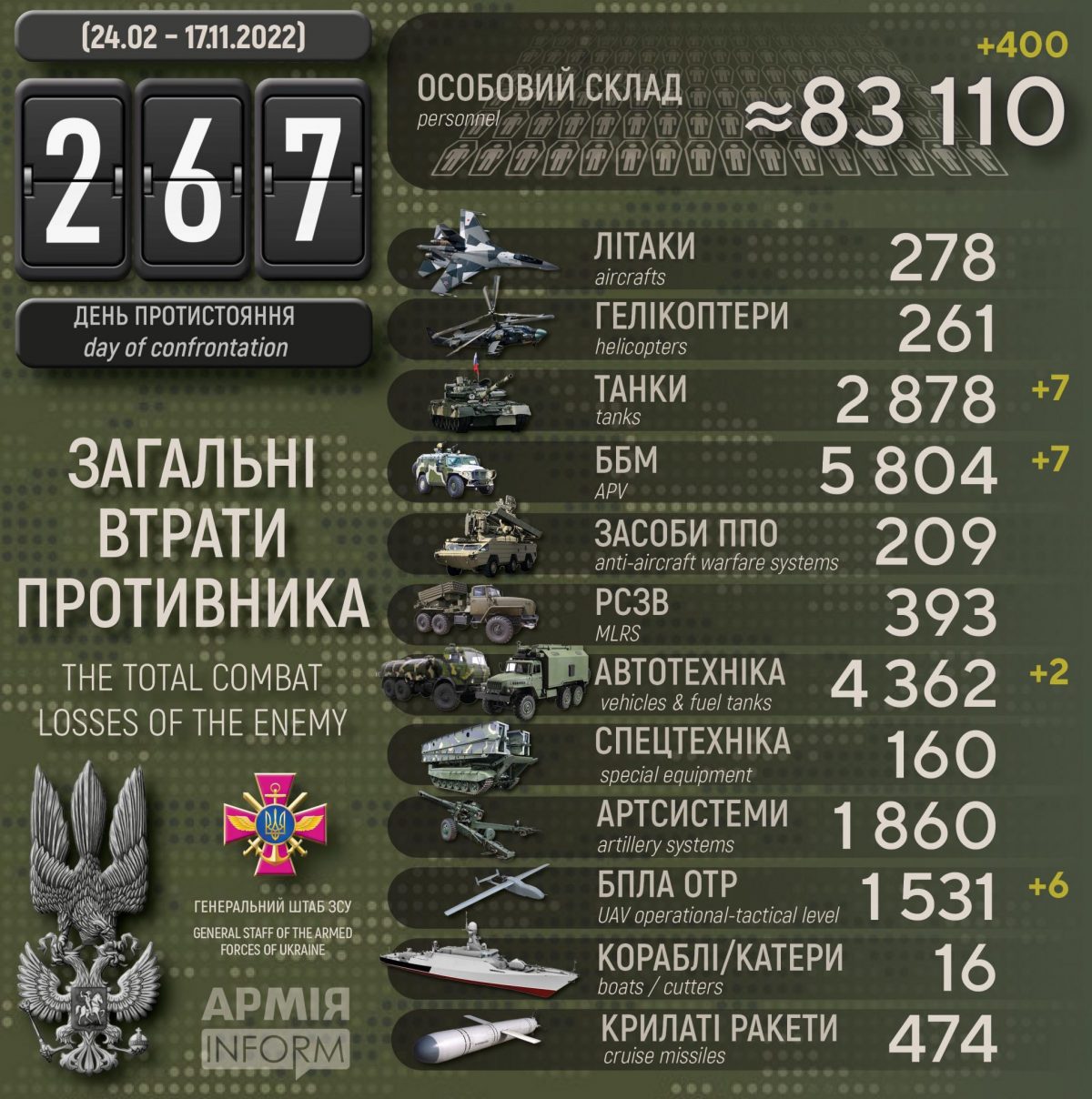 Загальні бойові втрати противника з 24.02 по 17.11 орієнтовно становлять: