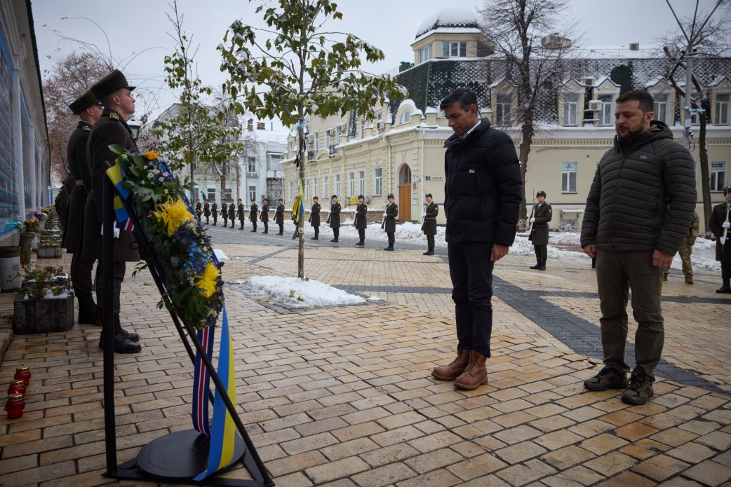 Президент України Володимир Зеленський і Прем’єр-міністр Великої Британії Ріші Сунак, який перебуває в нашій країні з візитом, ушанували пам’ять українських захисників та оглянули виставку знищеної російської техніки.