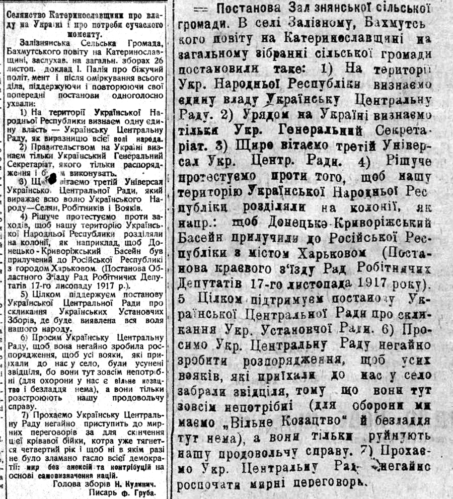Рішуче на підтримку Третього Універсалу висловилась Залізнянська сільська громада Бахмутського повіту, який належав до тогочасної Катеринославської губернії. На загальних зборах мешканці села Залізне (нині Бахмутський район Донецької області) твердо заявили, що визнають єдиними законними органами влади в Україні Центральну Раду та Генеральний Секретаріат, проголошення Української Народної Республіки «виражає всю волю Українського Народу — Селян, Робітників, Вояків». Одночасно збори рішуче засудили спроби територіального поділу України і приєднання її частин до росії.