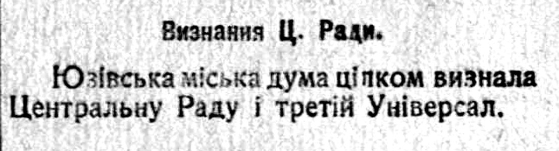 За визнання Центральної Ради і на підтримку Третього Універсалу виступила також міська дума Юзівки — сучасного Донецька. Таким чином депутати-гласні цього органу місцевого самоврядування засвідчили приналежність міста до Української Народної Республіки.