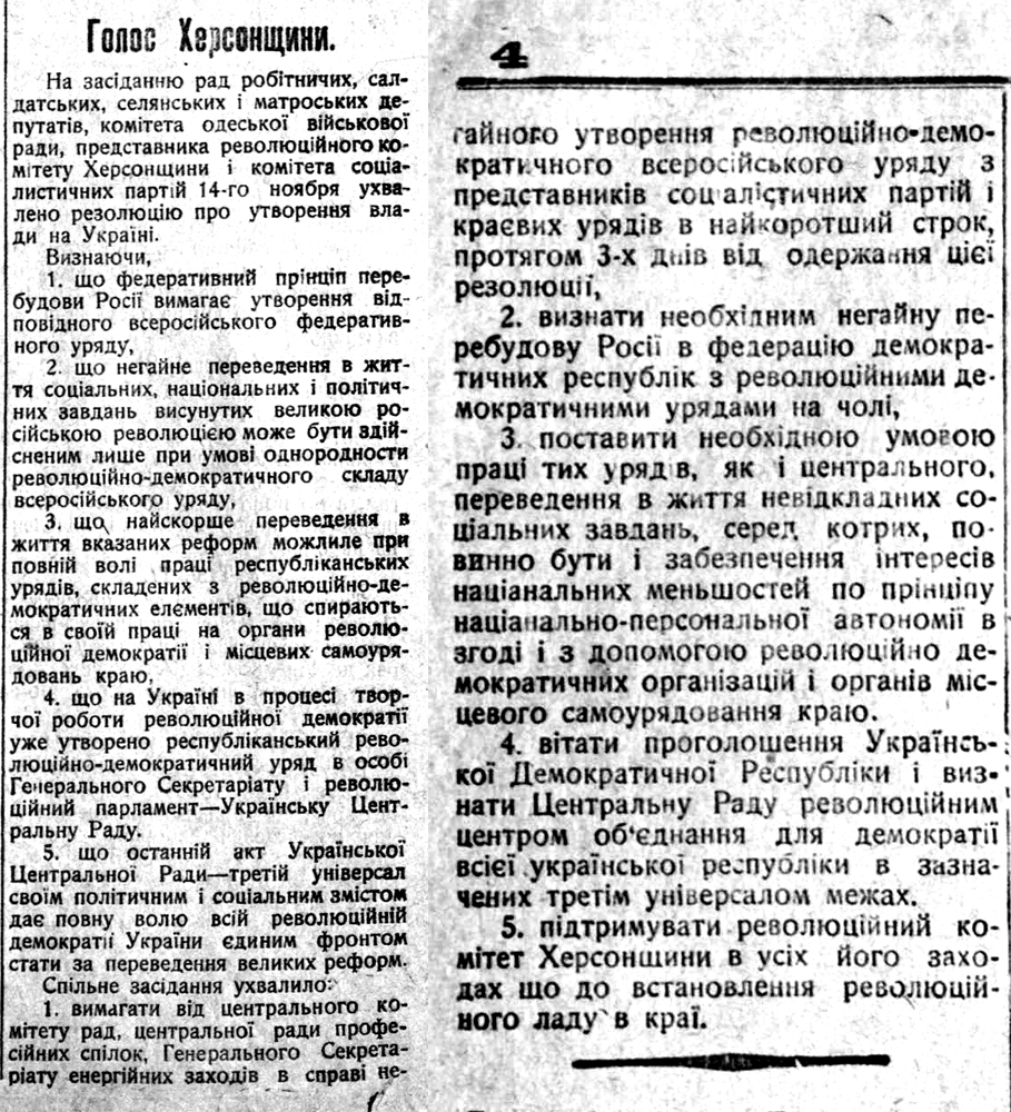 Не менш промовистими були й голоси тогочасної Херсонщини, представники якої визнали «революційно-демократичний уряд в особі Генерального Секретаріату і революційний парламент — Українську Центральну Раду», а Третій Універсал історичної ваги документом, який «своїм політичним і соціальним змістом дає повну волю всій революційній демократії України єдиним фронтом стати за переведення великих реформ». Вони ухвалили «вітати проголошення Української Демократичної Республіки і визнати Центральну Раду революційним центром об’єднання для демократії всієї української республіки в зазначених Третім Універсалом межах».