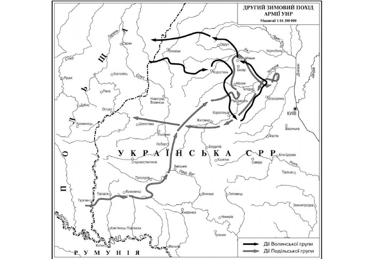 Головні надії у Другому Зимовому поході покладалися на Волинську групу. Вона мала стати основною ударною силою. 4 листопада вояки перейшли польсько-совєтський кордон. Передусім планувалося взяти Коростень. На певний час вдалося захопити міський залізничний вокзал і склад зі зброєю. Крім того, випустили 470 політичних в’язнів, розстріляли чекістів і розігнали міліцію. Проте втримати місто не змогли і рушили вглиб України для об’єднання з Подільською групою.