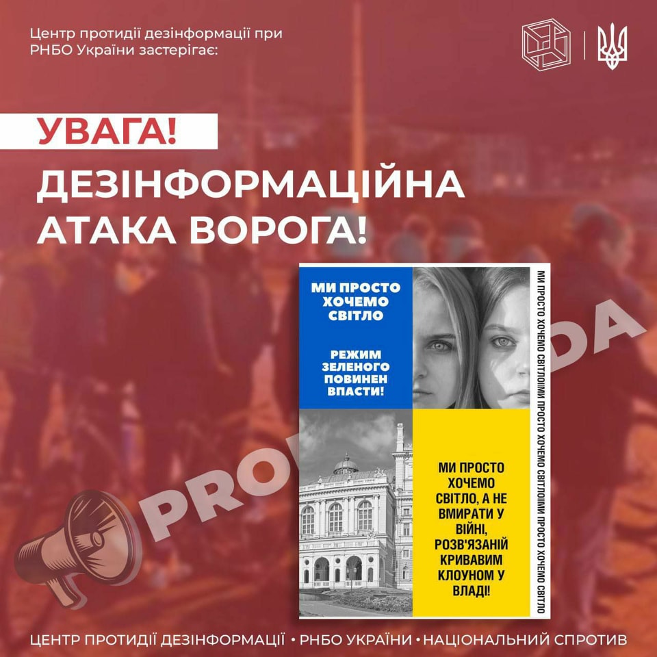 На картинках до тексту показана методичка зі створення і поширення пропаганди, основна мета якої — змусити українців повірити, що саме влада України винна у відсутності електроенергії.