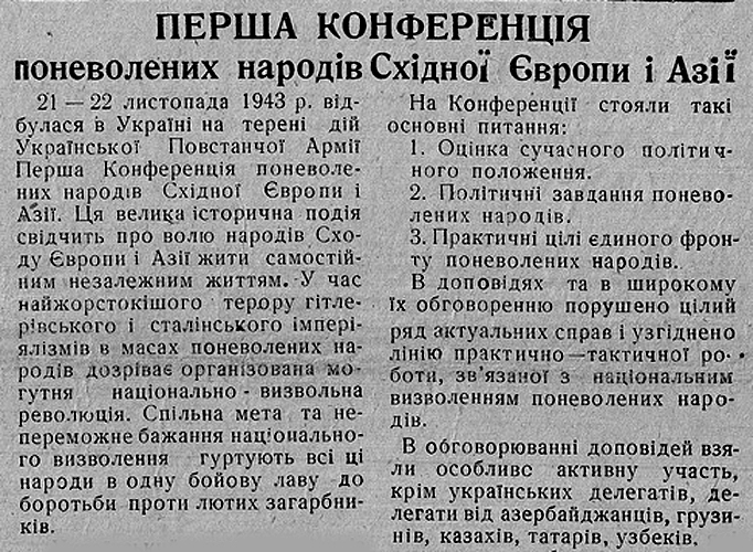 Україна завжди перебувала на передовій боротьби за визволення усіх гноблених імперською москвою народів. Нині, коли новітній російський імперіалізм силоміць і обманом відправляє одурених облудною кремлівською пропагандою представників підкорених росією націй воювати проти українського народу, важливим є привернення уваги до сторінок спільної боротьби народів проти рашизму. Однією з них є Перша конференція поневолених народів Східної Європи та Азії, організована проводом Організації Українських Націоналістів з огляду на те, що в лавах Української Повстанської Армії воювали представники багатьох інших національностей.