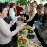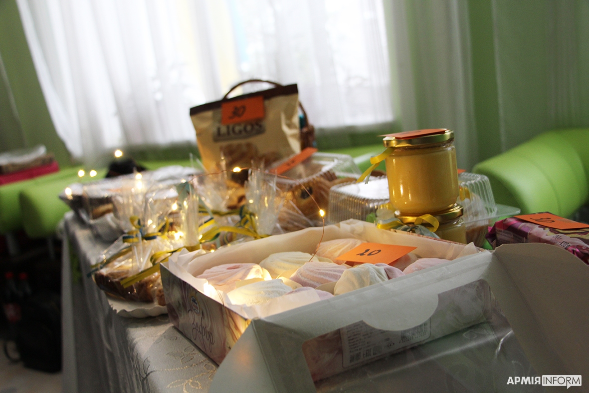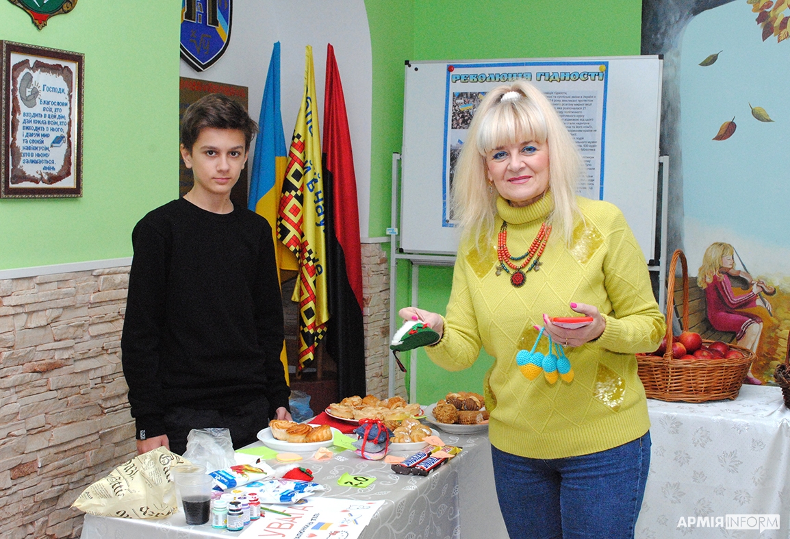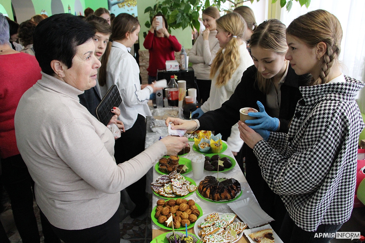 На великій перерві в холі навчального закладу людно. Учні продають, вчителі та батьки — купують. Заради майбутньої перемоги тут випікають, малюють, в’яжуть, пишуть вірші та видають поетичні збірки. Все, що продається на імітованих прилавках зроблено власноруч. З одного боку —патріотична продукція в синьо-жовтих кольорах, з іншого — пиріжки, торти, булочки, кава, чай, бутерброди, котлети по-київськи, помідори по-рівненськи, сосиски в тісті, хліб із салом та огірком — усе чим багата рідна земля. За столом від 8-В продає смаколики староста класу Оля. Дівчинка з подругами пропонує випічку, що готували зночі. Каже, що в кожному виробі є частинка душі, тож попит на їхні пиріжки чималий. Більшість покупців, серед яких одна із перших — директорка закладу Наталія Володимирівна, платять та здачі не беруть, бо розуміють наскільки важливі такі ініціативи для нас та для перемог на фронті.