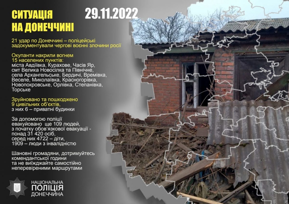 Під вогнем перебували міста Авдіївка, Курахове, Часів Яр, смт Велика Новосілка та Північне, села Архангельське, Бердичі, Времівка, Веселе, Миколаївка, Красногорівка, Новопокровське, Орлівка, Степанівка, Торське.