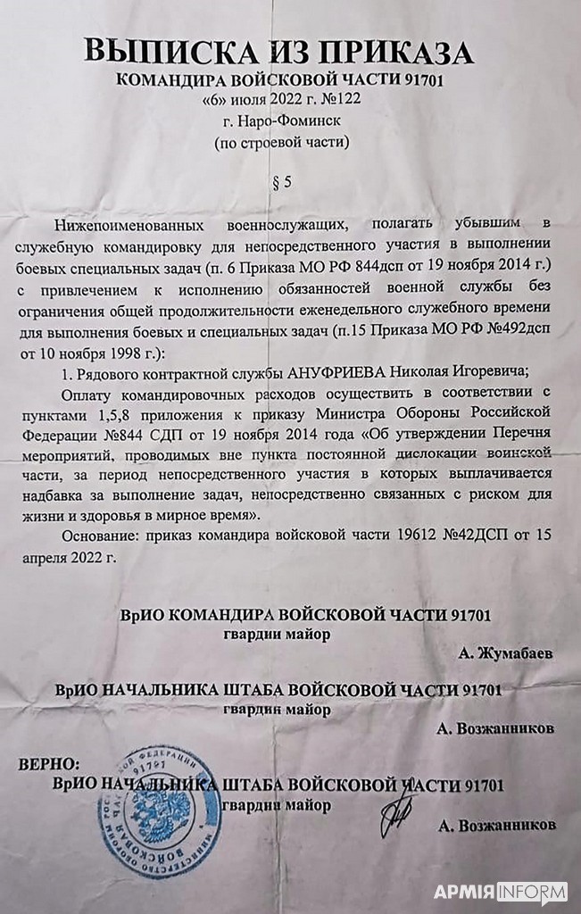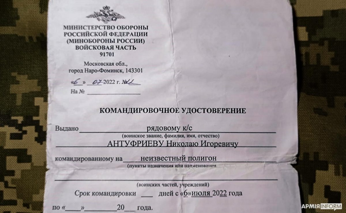 Під час проведення чергового успішного наступу Збройних Сил України було знищено командний пункт російських загарбників. І ось який цікавий документ потрапив до рук наших захисників. Це посвідчення на відрядження рядовому Антуфрієву Миколі Ігорьовичу, який проходить службу в 423-му гвардійському мотострілецькому полку в\ч 91701, дислокованому в місті нарофомінськ московської області, а також витяг із наказу командира цієї частини.