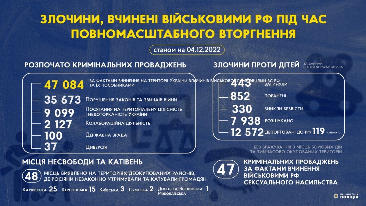 З початку повномасштабного вторгнення росії в Україну слідчі Національної поліції України розпочали 47 084 кримінальних проваджень за фактами вчинення на території України злочинів військовослужбовцями збройних сил російської федерації та їхніми пособниками.