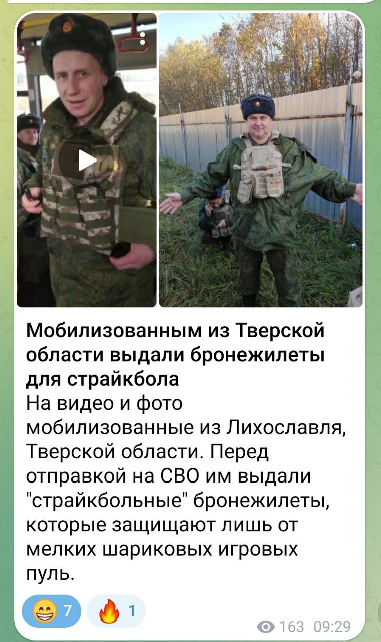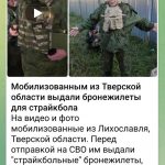 А чим саме забезпечують — розповідають у соцмережах все ті ж «чмобіки». Так, примусово загнаним до війська рф чоловікам із тверської області, мабуть, не щастило ще з того моменту, коли вони з’явилися на світ у населеному пункті з промовистою назвою Лихославль. Як повідомив допис на сторінці у пропагандистській соцмережі «ВКонтакте» з гордим найменням «Фонд поддержки Лихославль», мобілізованим повидавали бронежилети найменшого розміру, спроможних захистити хіба що тендітну дівчину.