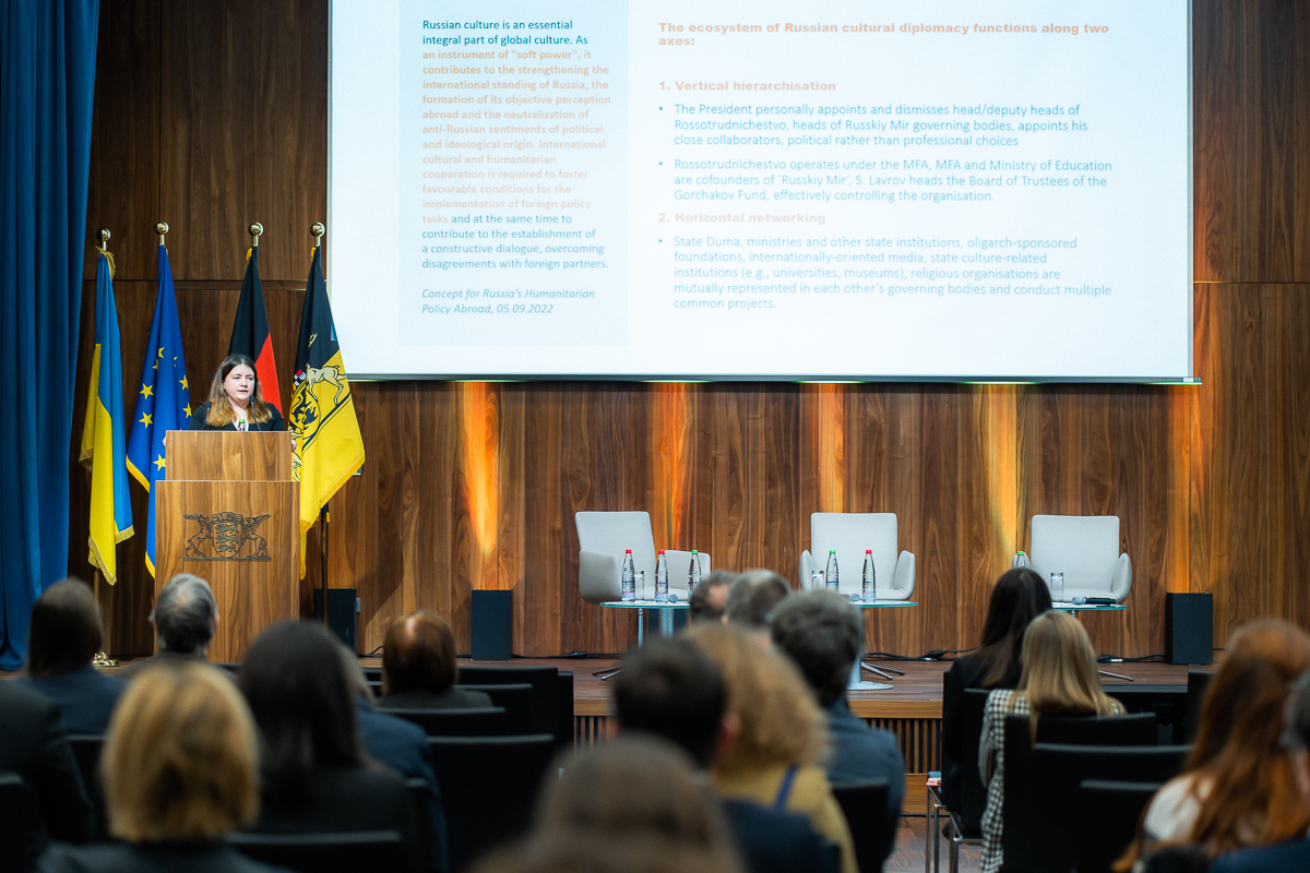 Завідувачка інформаційно-аналітичного відділу Українського Інституту Надія Коваль презентувала результати дослідження поточної роботи російських установ культурної дипломатії. Основні три установи, над якими зосередили свою увагу — росспівробітництво, Фонд «русский мир» та Фонд Горчакова. Як зазначила Коваль, росія пропагує концепт «русского мира, який існує там, де говорять російською мовою. Основними країнами, на які розрахована культурна політика москви, це росія, Україна, білорусь. Внутрішній вимір — це колишні республіки срср, зовнішній — це православні країни, а ще більш міжнародний вимір — це країни з традиційними цінностями, які створюють, на думку росії, багатополярний світ».