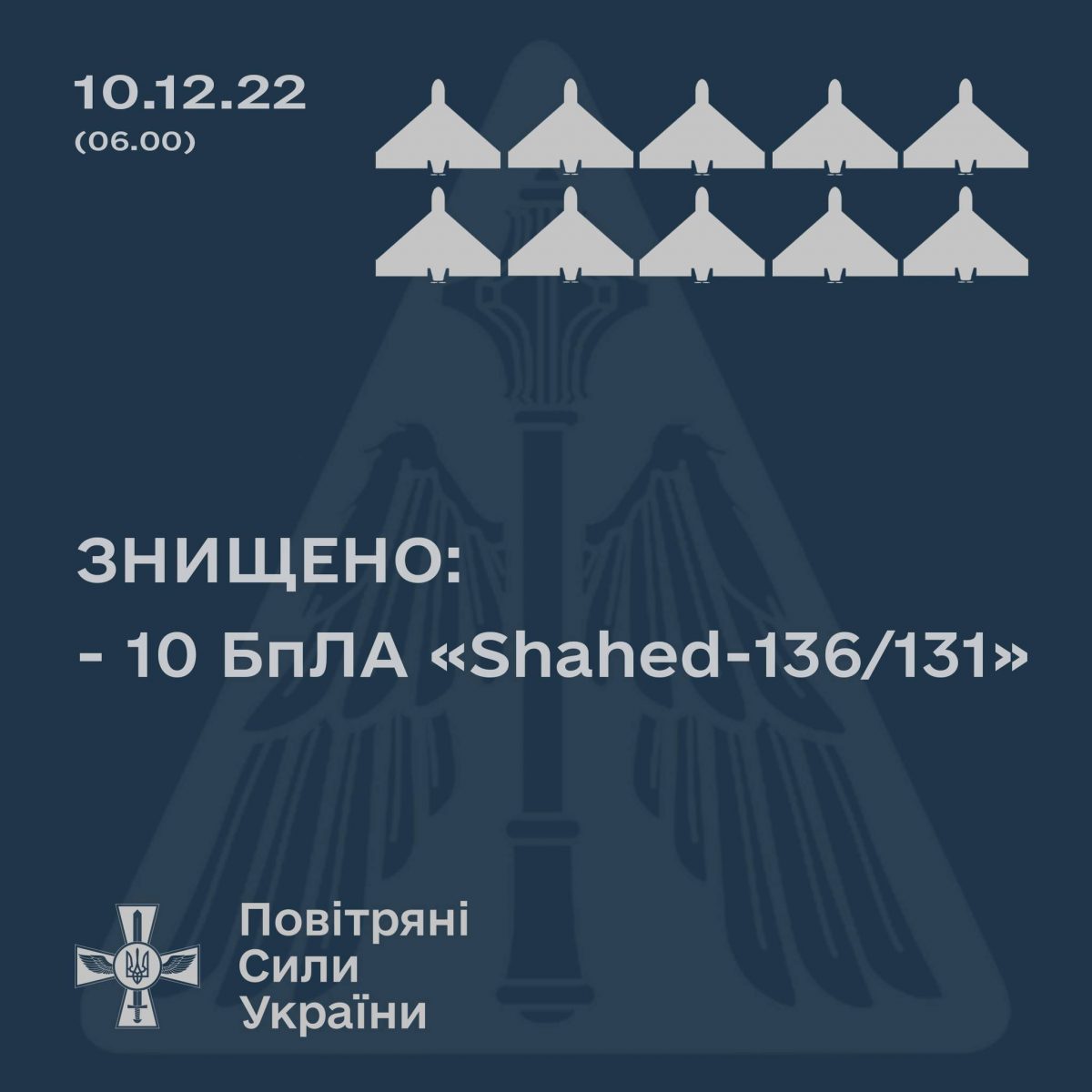 «Вночі, 10 грудня, російські окупанти атакували південь України дронами-камікадзе «Shahed-136/131» іранського виробництва. Підрозділами повітряного командування “Південь” Повітряних Сил ЗС України збито десять ворожих дронів-камікадзе над Херсонською, Миколаївською та Одеською областями», – йдеться в повідомленні.