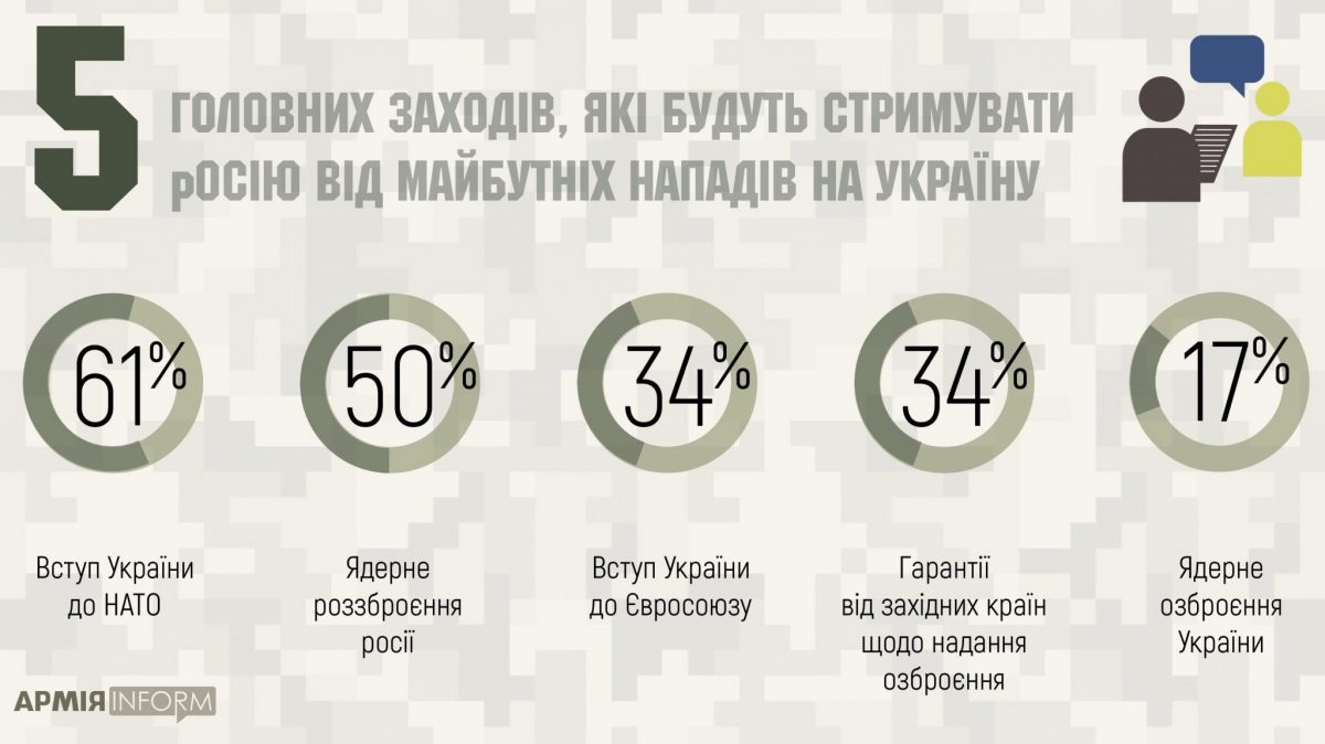 Переважна більшість українців вважають, що найефективнішим захистом від агресії росії є вступ України до НАТО – такої думки дотримується 61% респондентів. Також, за даними останнього опитування Соціологічної групи «Рейтинг», половина українців вважають, що саме ядерне роззброєння росії є найкращим захистом від агресії кремля у майбутньому. При цьому, 17% респондентів переконані в тому, що ядерне озброєння України може стати умовою для гарантування безумовної безпеки держави. А третина опитаних схиляється до думки, що гарантії безпеки від західних партнерів або членство України в Євросоюзі зможуть найефективнішим чином забезпечити захист країни.