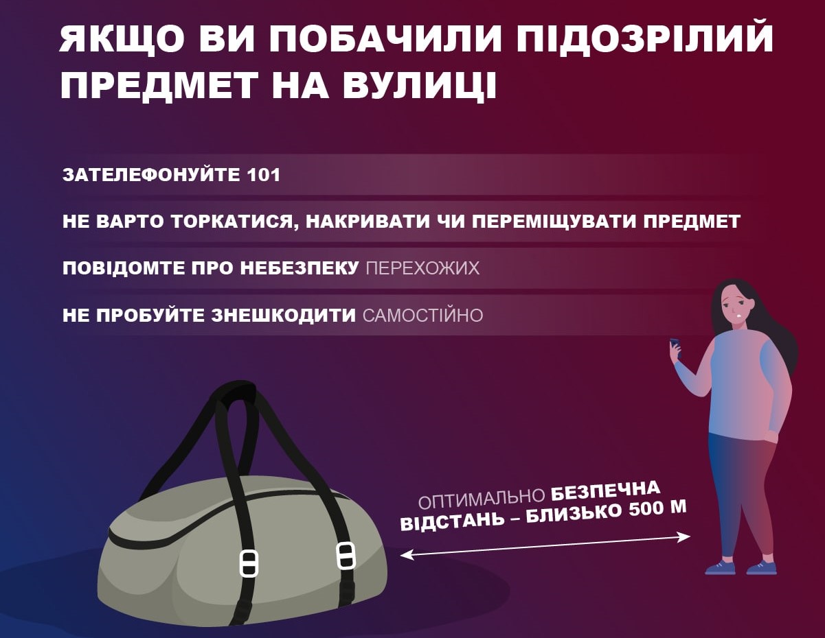 Якщо ви виявили підозрілий предмет, у жодному разі не торкайтеся знахідок власноруч і не дозволяйте це робити іншим. А також: