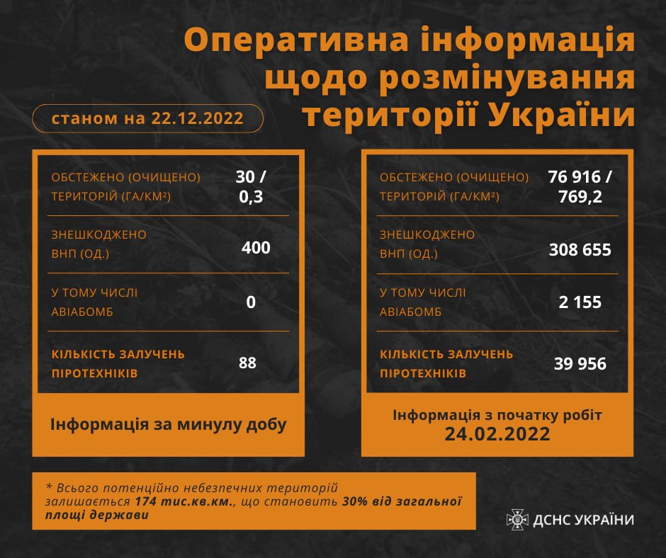 Станом на 22 грудня піротехнічні підрозділи Державної служби України з надзвичайних ситуацій залучалися до виконання завдань з розмінування 88 разів.