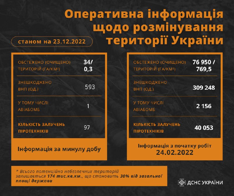 Станом на 23 грудня піротехнічні підрозділи Державної служби України з надзвичайних ситуацій залучалися до виконання завдань з розмінування 97 разів.