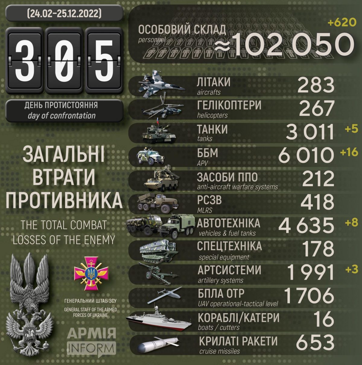 За даними Генерального штабу Збройних Сил України, загальні бойові втрати противника з 24.02 по 25.12 орієнтовно становлять: