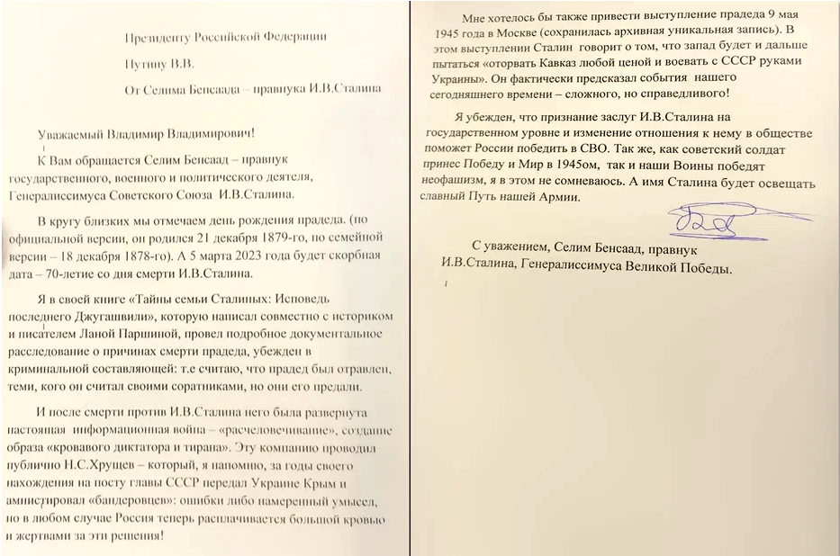 Текст звернення, яке нащадок генералісимуса «планує незабаром направити до адміністрації президента», першим опублікував прокремлівський портал News.ru. Бенсаад закликаєне тільки посмертно реабілітувати вусатого людожера, але й законодавчо заборонити називати його “кривавим тираном«.Також він просить дозволу на ексгумацію тіла «вождя» з його подальшим перепохованням з військовими почестями на Новодєвічому цвинтарі, згідно з «останньою волею» йосипа.
